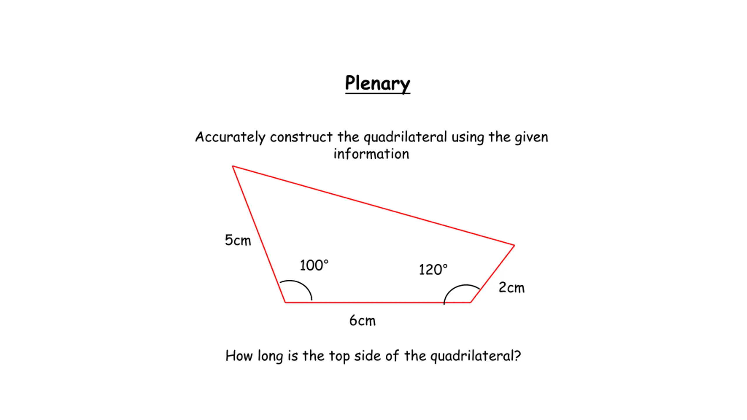 Plenary Accurately construct the quadrilateral using the given information 5cm 100 120 2cm 6cm How long is the top side of the quadrilateral?