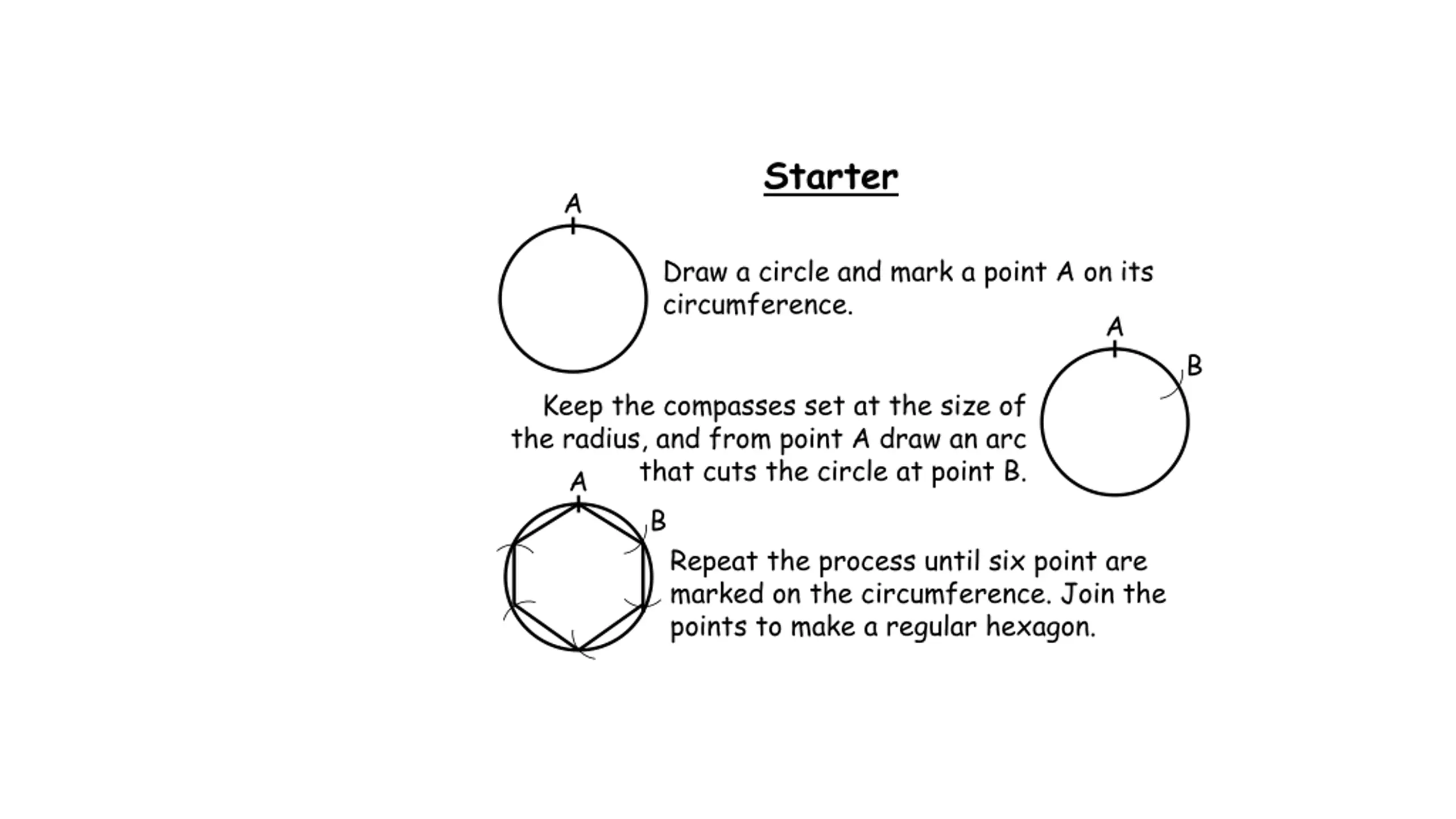 Starter A Draw a circle and mark a point A on its circumference. A B Keep the compasses set at the size of the radius, and from point A draw an arc that cuts the circle at point B. A B Repeat the process until six point are marked on the circumference. Join the points to make a regular hexagon.