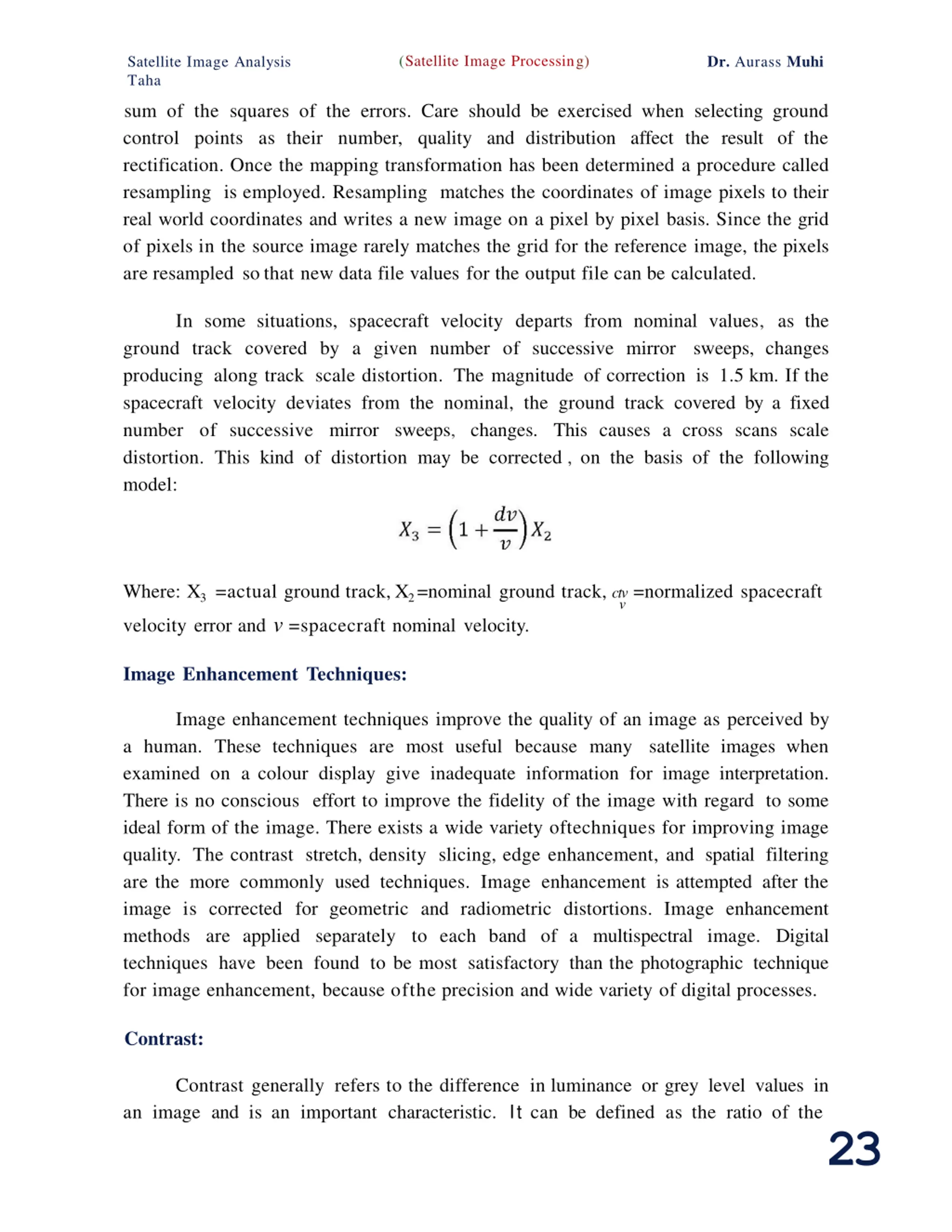 (Satellite Image Processing) Dr. Aurass Muhi Satellite Image Analysis Taha sum of the squares of the errors. Care should be exercised when selecting ground control points as their number, quality and distribution affect the result of the rectification. Once the mapping transformation has been determined a procedure called resampling is employed. Resampling matches the coordinates of image pixels to their real world coordinates and writes a new image on a pixel by pixel basis. Since the grid of pixels in the source image rarely matches the grid for the reference image, the pixels are resampled so that new data file values for the output file can be calculated. In some situations, spacecraft velocity departs from nominal values, as the ground track covered by a given number of successive mirror producing along track scale distortion. The magnitude of correction is 1.5 km. If the spacecraft velocity deviates from the nominal, the ground track covered by a fixed number of successive mirror sweeps, changes. This causes a cross scans scale distortion. This kind of distortion may be corrected , on the basis of the following model: sweeps, changes Where: X3 =actual ground track, X2=nominal ground track, ctv =normalized spacecraft velocity error and v =spacecraft nominal velocity. v Image Enhancement Techniques: Image enhancement techniques improve the quality of an image as perceived by a human. These techniques are most useful because many satellite images when examined on a colour display give inadequate information for image interpretation. There is no conscious effort to improve the fidelity of the image with regard to some ideal form of the image. There exists a wide variety oftechniques for improving image quality. The contrast stretch, density slicing, edge enhancement, and spatial filtering are the more commonly used techniques. Image enhancement is attempted after the image is corrected for geometric and radiometric distortions. Image enhancement methods are applied separately to each band of a multispectral image. Digital techniques have been found to be most satisfactory than the photographic technique for image enhancement, because ofthe precision and wide variety of digital processes. Contrast: Contrast generally refers to the difference in luminance or grey level values in an image and is an important characteristic. It can be defined as the ratio of the23