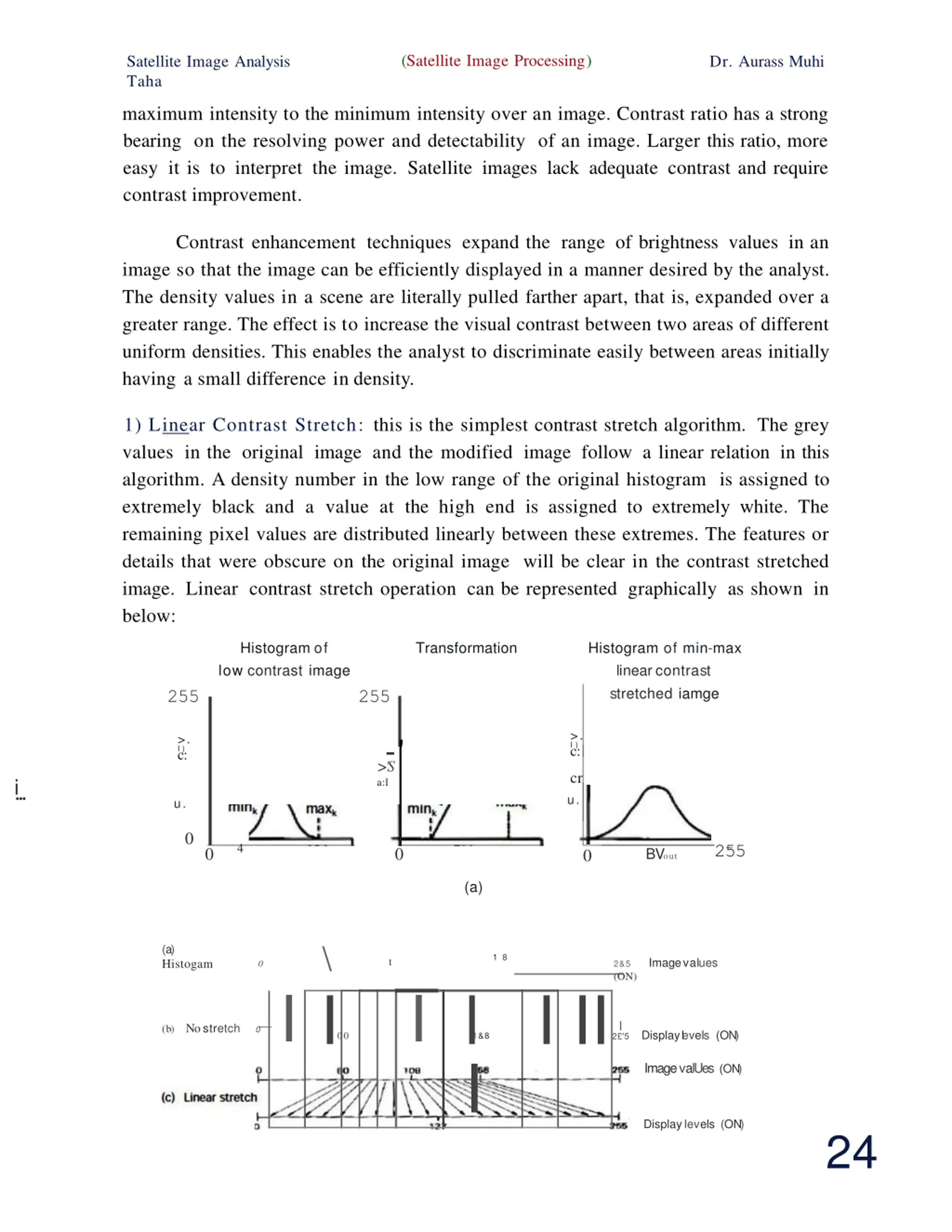 (Satellite Image Processing) Satellite Image Analysis Taha Dr. Aurass Muhi maximum intensity to the minimum intensity over an image. Contrast ratio has a strong bearing on the resolving power and detectability of an image. Larger this ratio, more easy it is to interpret the image. Satellite images lack adequate contrast and require contrast improvement. Contrast enhancement techniques expand the range of brightness values in an image so that the image can be efficiently displayed in a manner desired by the analyst. The density values in a scene are literally pulled farther apart, that is, expanded over a greater range. The effect is to increase the visual contrast between two areas of different uniform densities. This enables the analyst to discriminate easily between areas initially having a small difference in density. 1) Linear Contrast Stretch: this is the simplest contrast stretch algorithm. The grey values in the original image and the modified image follow a linear relation in this algorithm. A density number in the low range of the original histogram is assigned to extremely black and a value at the high end is assigned to extremely white. The remaining pixel values are distributed linearly between these extremes. The features or details that were obscure on the original image will be clear in the contrast stretched image. Linear contrast stretch operation can be represented graphically as shown in below: Histogram of low contrast image Transformation Histogram of min-max linearcontrast stretched iamge 255 255 >. I ) c: >. I ) c: -' >'S a:l cr u. i... u. 0 4 255 0 0 BVout 0 (a) \ (a) Histogam 1 8 2&5 Imagevalues (ON) I 0 I I I l I II I (b) Nostretch 0 2 '5 Displaylevels (ON) 00 1&8 I ImagevalUes (ON) Displaylevels (ON) 24