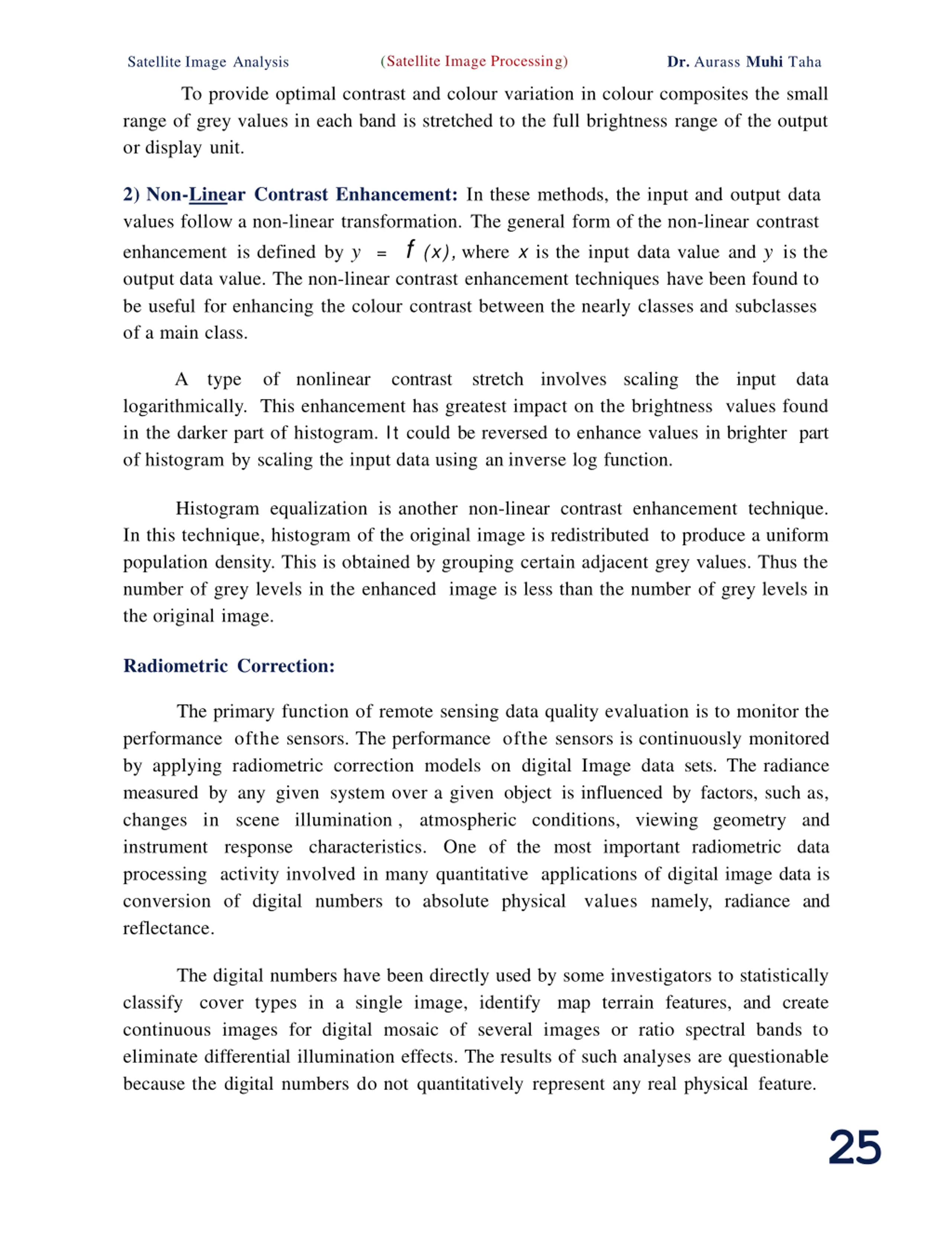 (Satellite Image Processing) Dr. Aurass Muhi Taha Satellite Image Analysis To provide optimal contrast and colour variation in colour composites the small range of grey values in each band is stretched to the full brightness range of the output or display unit. 2) Non-Linear Contrast Enhancement: In these methods, the input and output data values follow a non-linear transformation. The general form of the non-linear contrast enhancement is defined by y = f (x), where x is the input data value and y is the output data value. The non-linear contrast enhancement techniques have been found to be useful for enhancing the colour contrast between the nearly classes and subclasses of a main class. A type of nonlinear contrast stretch involves scaling the input data logarithmically. This enhancement has greatest impact on the brightness values found in the darker part of histogram. It could be reversed to enhance values in brighter part of histogram by scaling the input data using an inverse log function. Histogram equalization is another non-linear contrast enhancement technique. In this technique, histogram of the original image is redistributed to produce a uniform population density. This is obtained by grouping certain adjacent grey values. Thus the number of grey levels in the enhanced image is less than the number of grey levels in the original image. Radiometric Correction: The primary function of remote sensing data quality evaluation is to monitor the performance ofthe sensors. The performance ofthe sensors is continuously monitored by applying radiometric correction models on digital Image data sets. The radiance measured by any given system over a given object is influenced by factors, such as, changes in scene illumination , atmospheric conditions, viewing geometry and instrument response characteristics. One of the most important radiometric data processing activity involved in many quantitative applications of digital image data is conversion of digital numbers to absolute physical reflectance. values namely, radiance and The digital numbers have been directly used by some investigators to statistically classify cover types in a single image, identify map terrain features, and create continuous images for digital mosaic of several images or ratio spectral bands to eliminate differential illumination effects. The results of such analyses are questionable because the digital numbers do not quantitatively represent any real physical feature. 25