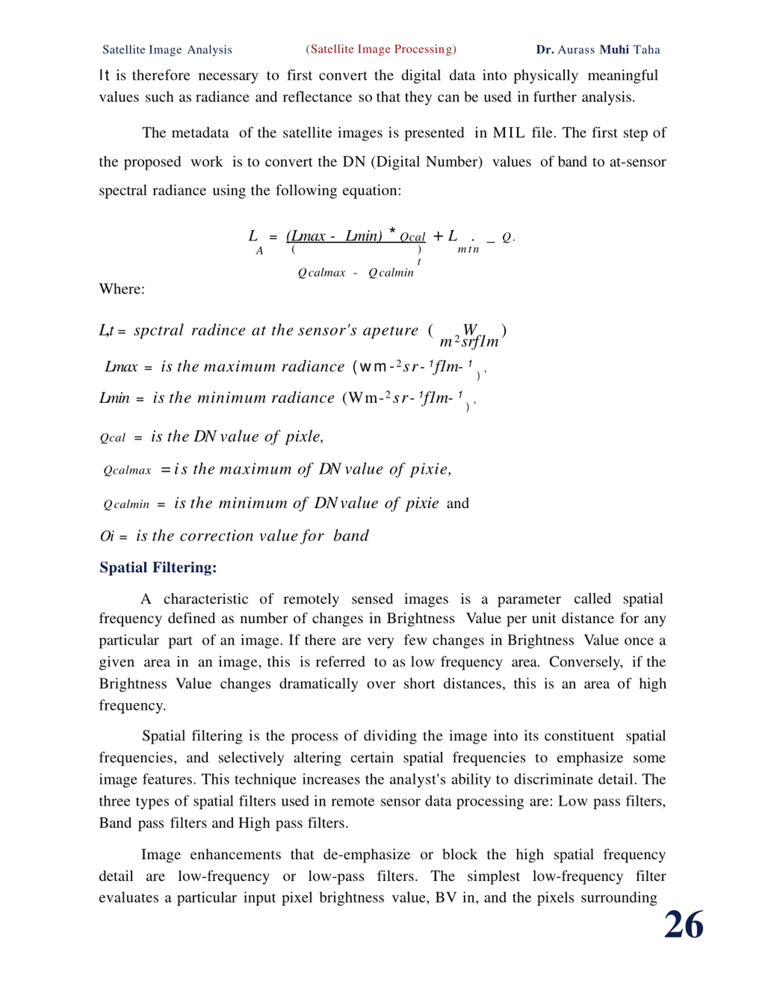 (Satellite Image Processing) Dr. Aurass Muhi Taha Satellite Image Analysis It is therefore necessary to first convert the digital data into physically meaningful values such as radiance and reflectance so that they can be used in further analysis. The metadata of the satellite images is presented in MIL file. The first step of the proposed work is to convert the DN (Digital Number) values of band to at-sensor spectral radiance using the following equation: L = (Lmax - Lmin) * Qcal + L . _ Q. A ( ) t mtn Qcalmax - Qcalmin Where: L,t = spctral radince at the sensor's apeture ( ) W m2srf1m Lmax = is the maximum radiance (wm-2sr-1f1m-1 , ) Lmin = is the minimum radiance (Wm-2sr-1f1m-1 , ) Qcal = is the DN value of pixle, Qcalmax =is the maximum of DN value of pixie, Qcalmin = is the minimum of DN value of pixie and Oi = is the correction value for band Spatial Filtering: A characteristic of remotely sensed images is a parameter called spatial frequency defined as number of changes in Brightness Value per unit distance for any particular part of an image. If there are very few changes in Brightness Value once a given area in an image, this is referred to as low frequency area. Conversely, if the Brightness Value changes dramatically over short distances, this is an area of high frequency. Spatial filtering is the process of dividing the image into its constituent spatial frequencies, and selectively altering certain spatial frequencies to emphasize some image features. This technique increases the analyst's ability to discriminate detail. The three types of spatial filters used in remote sensor data processing are: Low pass filters, Band pass filters and High pass filters. Image enhancements that de-emphasize or block the high spatial frequency detail are low-frequency or low-pass filters. The simplest low-frequency filter evaluates a particular input pixel brightness value, BV in, and the pixels surrounding 26