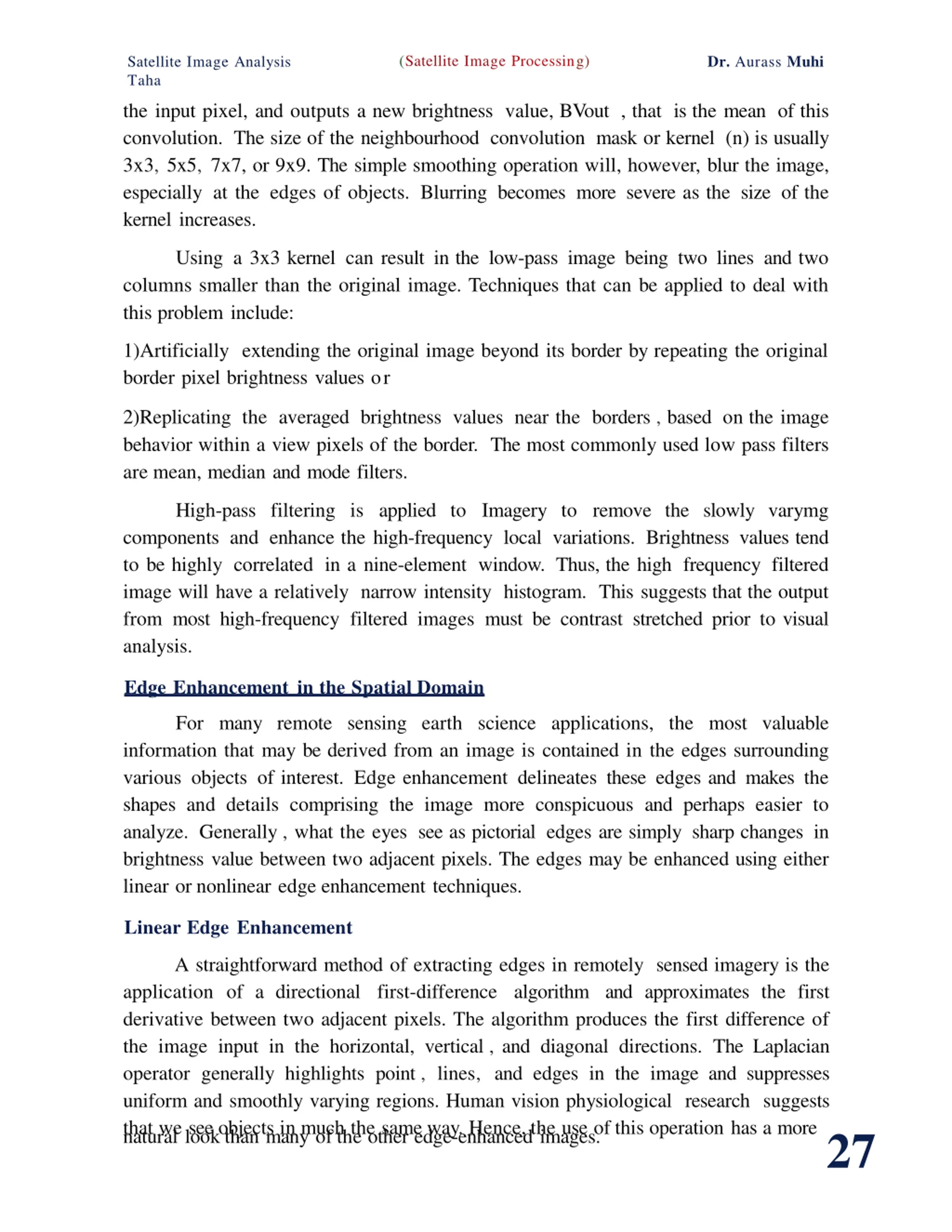 (Satellite Image Processing) Dr. Aurass Muhi Satellite Image Analysis Taha the input pixel, and outputs a new brightness value, BVout , that is the mean of this convolution. The size of the neighbourhood convolution mask or kernel (n) is usually 3x3, 5x5, 7x7, or 9x9. The simple smoothing operation will, however, blur the image, especially at the edges of objects. Blurring becomes more severe as the size of the kernel increases. Using a 3x3 kernel can result in the low-pass image being two lines and two columns smaller than the original image. Techniques that can be applied to deal with this problem include: 1)Artificially extending the original image beyond its border by repeating the original border pixel brightness values or 2)Replicating the averaged brightness values near the borders , based on the image behavior within a view pixels of the border. The most commonly used low pass filters are mean, median and mode filters. High-pass filtering is applied to Imagery to remove the slowly varymg components and enhance the high-frequency local variations. Brightness values tend to be highly correlated in a nine-element window. Thus, the high frequency filtered image will have a relatively narrow intensity histogram. This suggests that the output from most high-frequency filtered images must be contrast stretched prior to visual analysis. Edge Enhancement in the Spatial Domain For many remote sensing earth science applications, the most valuable information that may be derived from an image is contained in the edges surrounding various objects of interest. Edge enhancement delineates these edges and makes the shapes and details comprising the image more conspicuous and perhaps easier to analyze. Generally , what the eyes see as pictorial edges are simply sharp changes in brightness value between two adjacent pixels. The edges may be enhanced using either linear or nonlinear edge enhancement techniques. Linear Edge Enhancement A straightforward method of extracting edges in remotely sensed imagery is the application of a directional first-difference algorithm and approximates the first derivative between two adjacent pixels. The algorithm produces the first difference of the image input in the horizontal, vertical , and diagonal directions. The Laplacian operator generally highlights point , lines, and edges in the image and suppresses uniform and smoothly varying regions. Human vision physiological research suggests that we see objects in much the same way. Hence, the use of this operation has a more natural look than many of the other edge-enhanced images. 27