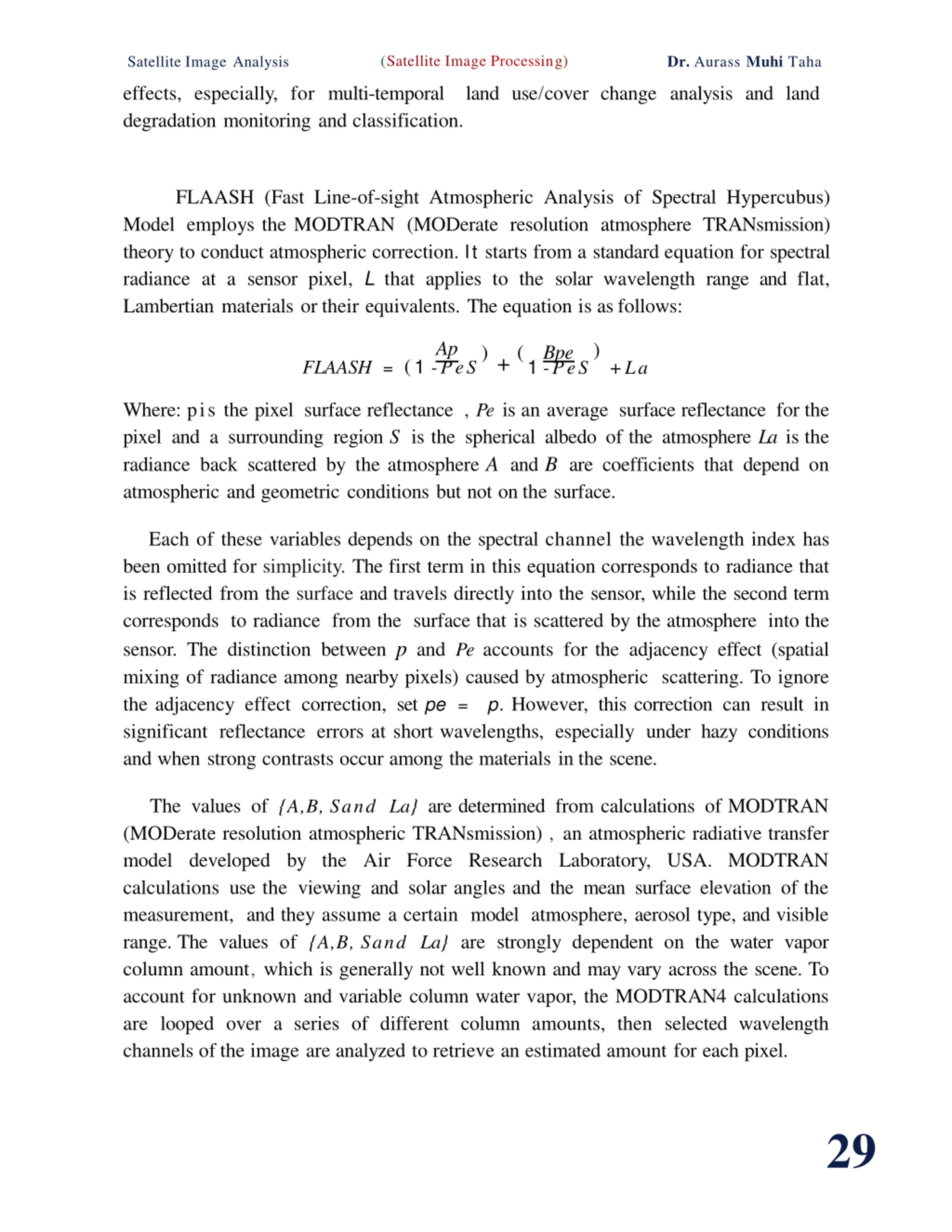 (Satellite Image Processing) Dr. Aurass Muhi Taha Satellite Image Analysis effects, especially, for multi-temporal degradation monitoring and classification. land use/cover change analysis and land FLAASH (Fast Line-of-sight Atmospheric Analysis of Spectral Hypercubus) Model employs the MODTRAN (MODerate resolution atmosphere TRANsmission) theory to conduct atmospheric correction. It starts from a standard equation for spectral radiance at a sensor pixel, L that applies to the solar wavelength range and flat, Lambertian materials or their equivalents. The equation is as follows: Ap -PeS ) )+( Bpe FLAASH = (1 1 -PeS +La Where: pis the pixel surface reflectance , Pe is an average surface reflectance for the pixel and a surrounding region S is the spherical albedo of the atmosphere La is the radiance back scattered by the atmosphere A and B are coefficients that depend on atmospheric and geometric conditions but not on the surface. Each of these variables depends on the spectral channel the wavelength index has been omitted for simplicity. The first term in this equation corresponds to radiance that is reflected from the surface and travels directly into the sensor, while the second term corresponds to radiance from the surface that is scattered by the atmosphere into the sensor. The distinction between p and Pe accounts for the adjacency effect (spatial mixing of radiance among nearby pixels) caused by atmospheric scattering. To ignore the adjacency effect correction, set pe = significant reflectance errors at short wavelengths, especially under hazy conditions and when strong contrasts occur among the materials in the scene. p. However, this correction can result in The values of {A,B, Sand La} are determined from calculations of MODTRAN (MODerate resolution atmospheric TRANsmission) , an atmospheric radiative transfer model developed by the Air Force Research Laboratory, USA. MODTRAN calculations use the viewing and solar angles and the mean surface elevation of the measurement, and they assume a certain model atmosphere, aerosol type, and visible range. The values of {A,B, Sand La} are strongly dependent on the water vapor column amount, which is generally not well known and may vary across the scene. To account for unknown and variable column water vapor, the MODTRAN4 calculations are looped over a series of different column amounts, then selected wavelength channels of the image are analyzed to retrieve an estimated amount for each pixel. 29