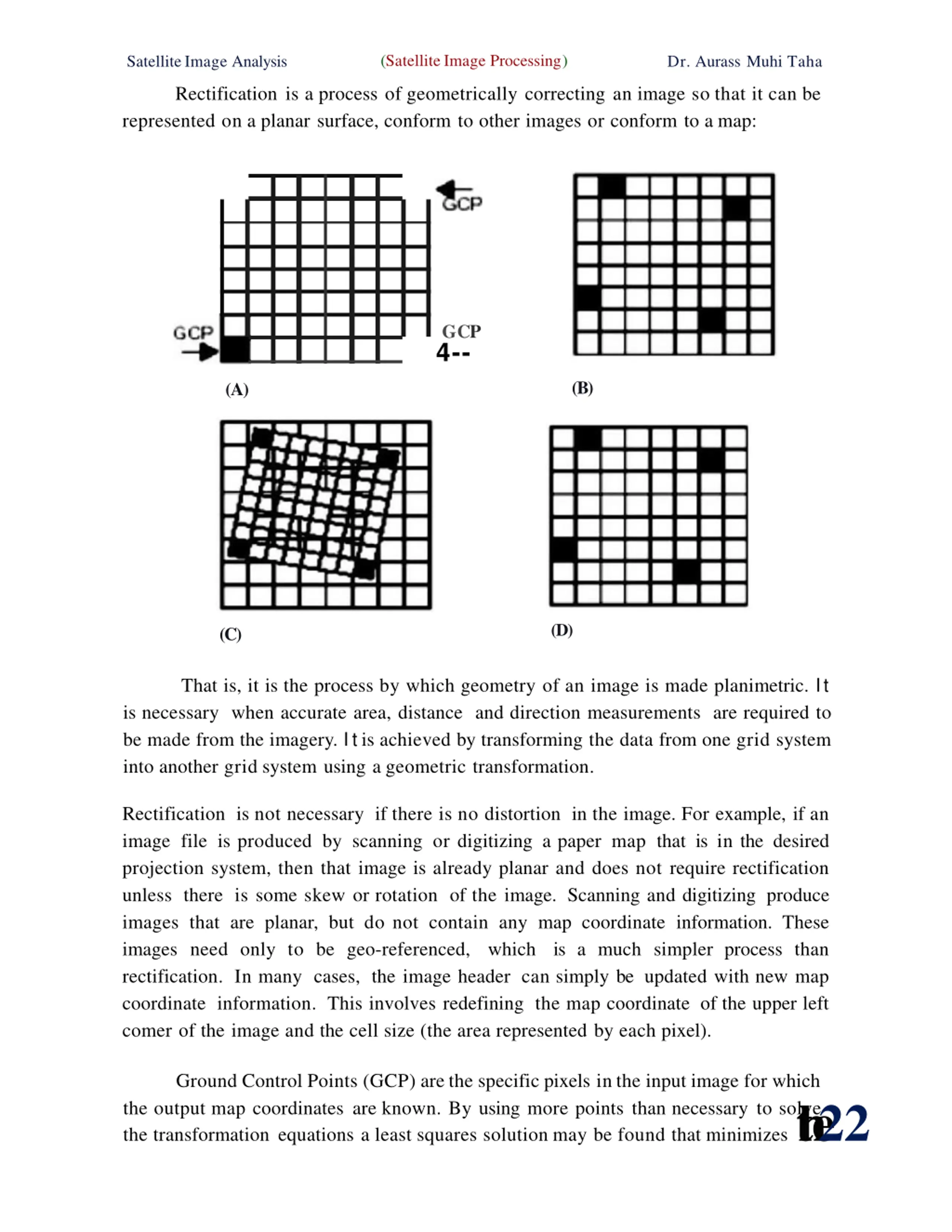 (Satellite Image Processing) SatelliteImage Analysis Dr. Aurass Muhi Taha Rectification is a process of geometrically correcting an image so that it can be represented on a planar surface, conform to other images or conform to a map: GCP 4-- (B) (A) (D) (C) That is, it is the process by which geometry of an image is made planimetric. It is necessary when accurate area, distance and direction measurements are required to be made from the imagery. It is achieved by transforming the data from one grid system into another grid system using a geometric transformation. Rectification is not necessary if there is no distortion in the image. For example, if an image file is produced by scanning or digitizing a paper map that is in the desired projection system, then that image is already planar and does not require rectification unless there is some skew or rotation of the image. Scanning and digitizing produce images that are planar, but do not contain any map coordinate information. These images need only to be geo-referenced, rectification. In many cases, the image header can simply be updated with new map coordinate information. This involves redefining the map coordinate of the upper left comer of the image and the cell size (the area represented by each pixel). which is a much simpler process than Ground Control Points (GCP) are the specific pixels in the input image for which the output map coordinates are known. By using more points than necessary to solve the transformation equations a least squares solution may be found that minimizest h e 22