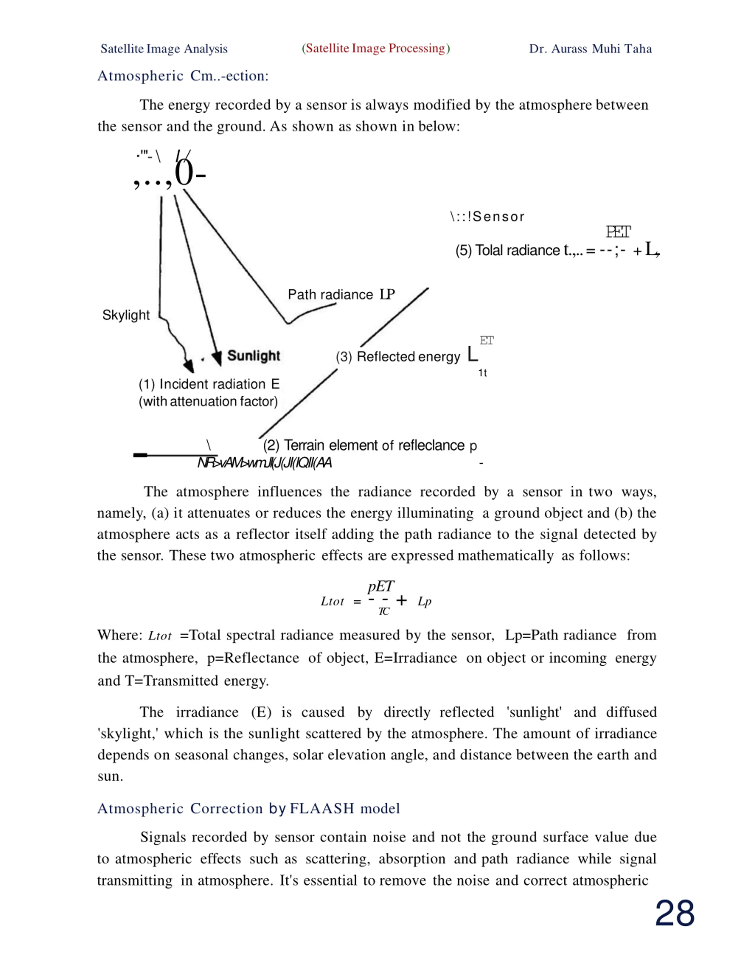 (SatelliteImage Processing) SatelliteImage Analysis Dr. Aurass Muhi Taha Atmospheric Cm..-ection: The energy recorded by a sensor is always modified by the atmosphere between the sensor and the ground. As shown as shown in below: ,..,0- "'-\ I / \::!Sensor P E T (5)Tolal radiancet.,..= --;- +L,. Path radiance LP Skylight ET (3) Reflected energy L 1t (1) Incident radiation E (withattenuation factor) - The atmosphere influences the radiance recorded by a sensor in two ways, namely, (a) it attenuates or reduces the energy illuminating a ground object and (b) the atmosphere acts as a reflector itself adding the path radiance to the signal detected by the sensor. These two atmospheric effects are expressed mathematically as follows: (2) Terrain element of refleclance p NR>vAM>wmJI(J(JI(IQII(AA \ - pET Ltot = - - + Lp TC Where: Ltot =Total spectral radiance measured by the sensor, Lp=Path radiance from the atmosphere, p=Reflectance of object, E=Irradiance on object or incoming energy and T=Transmitted energy. The irradiance (E) is caused by directly reflected 'sunlight' and diffused 'skylight,' which is the sunlight scattered by the atmosphere. The amount of irradiance depends on seasonal changes, solar elevation angle, and distance between the earth and sun. Atmospheric Correction by FLAASH model Signals recorded by sensor contain noise and not the ground surface value due to atmospheric effects such as scattering, absorption and path radiance while signal transmitting in atmosphere. It's essential to remove the noise and correct atmospheric 28