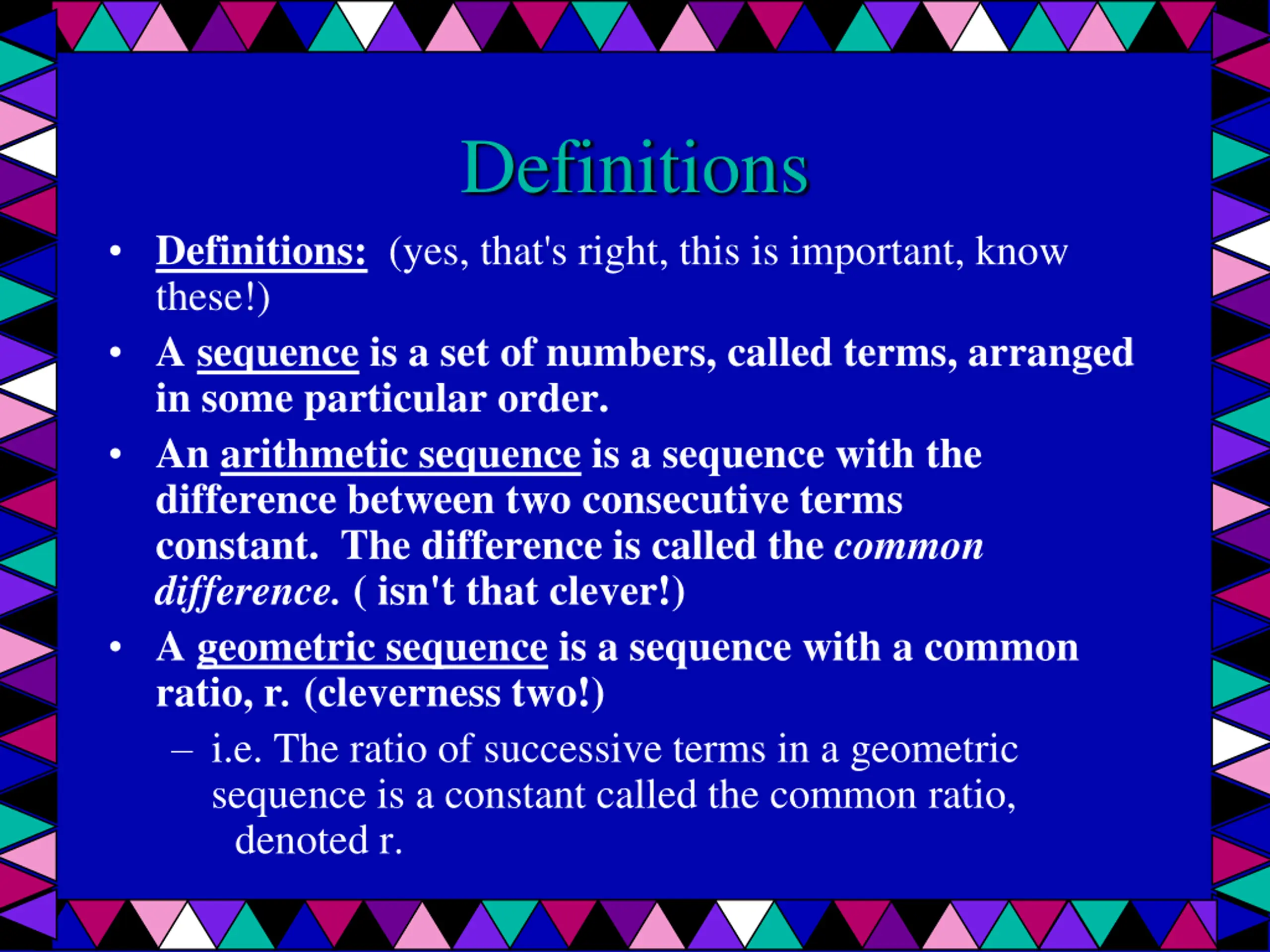 Definitions Definitions: (yes, that's right, this is important, know these!) A sequence is a set of numbers, called terms, arranged in some particular order. An arithmetic sequence is a sequence with the difference between two consecutive terms constant. The difference is called the common difference. ( isn't that clever!) A geometric sequence is a sequence with a common ratio, r. (cleverness two!) i.e. The ratio of successive terms in a geometric sequence is a constant called the common ratio, denoted r.