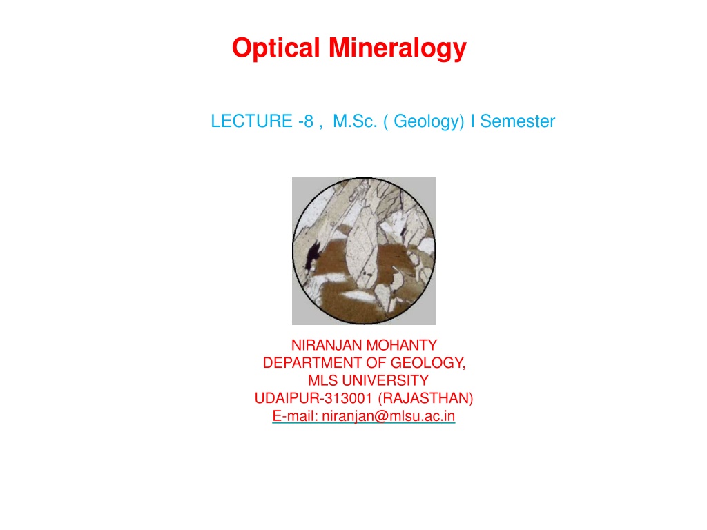 Optical Mineralogy LECTURE -8 , M.Sc. ( Geology) I Semester NIRANJAN MOHANTY DEPARTMENT OF GEOLOGY, MLS UNIVERSITY UDAIPUR-313001 (RAJASTHAN) E-mail: niranjan@mlsu.ac.in