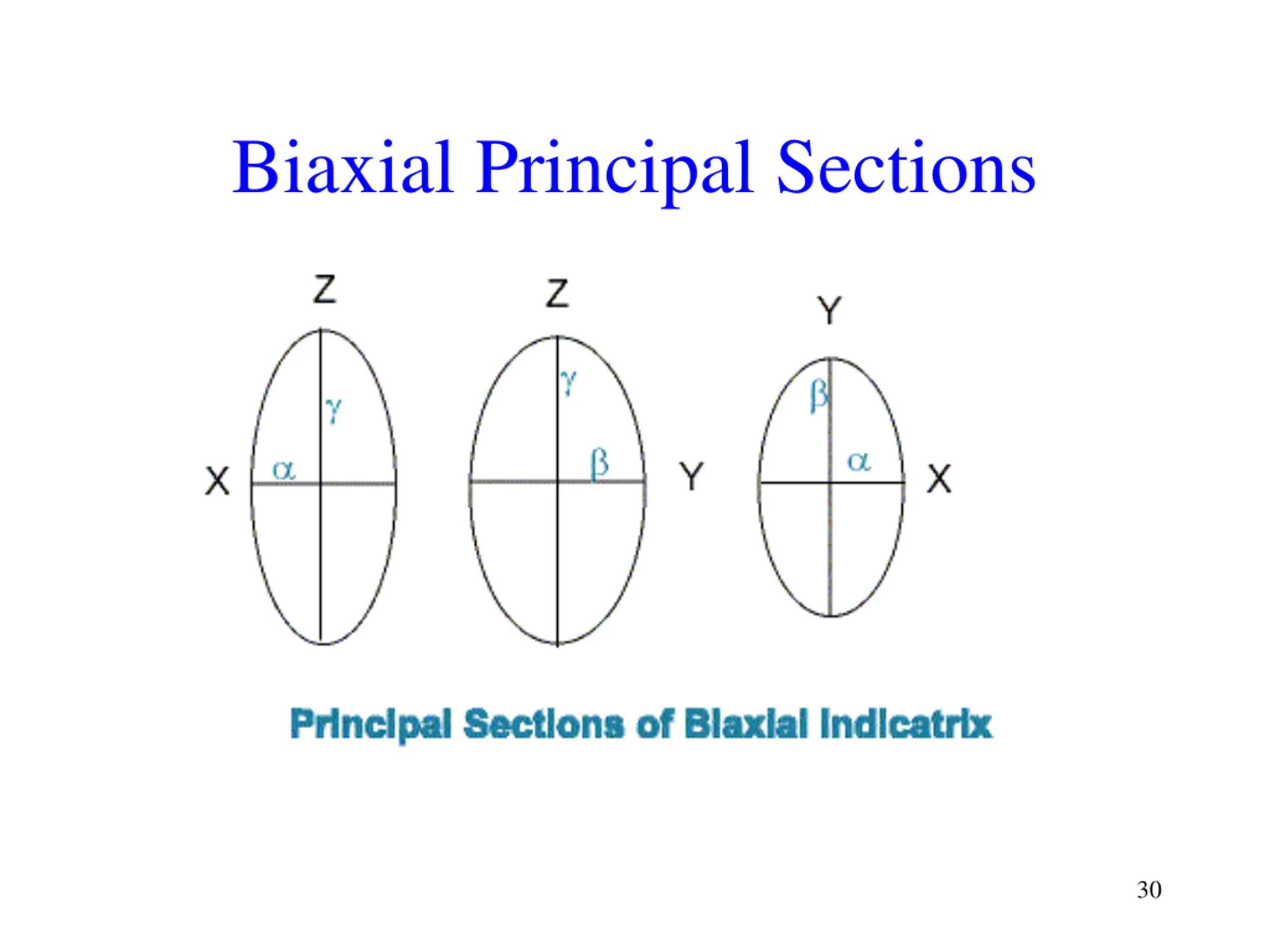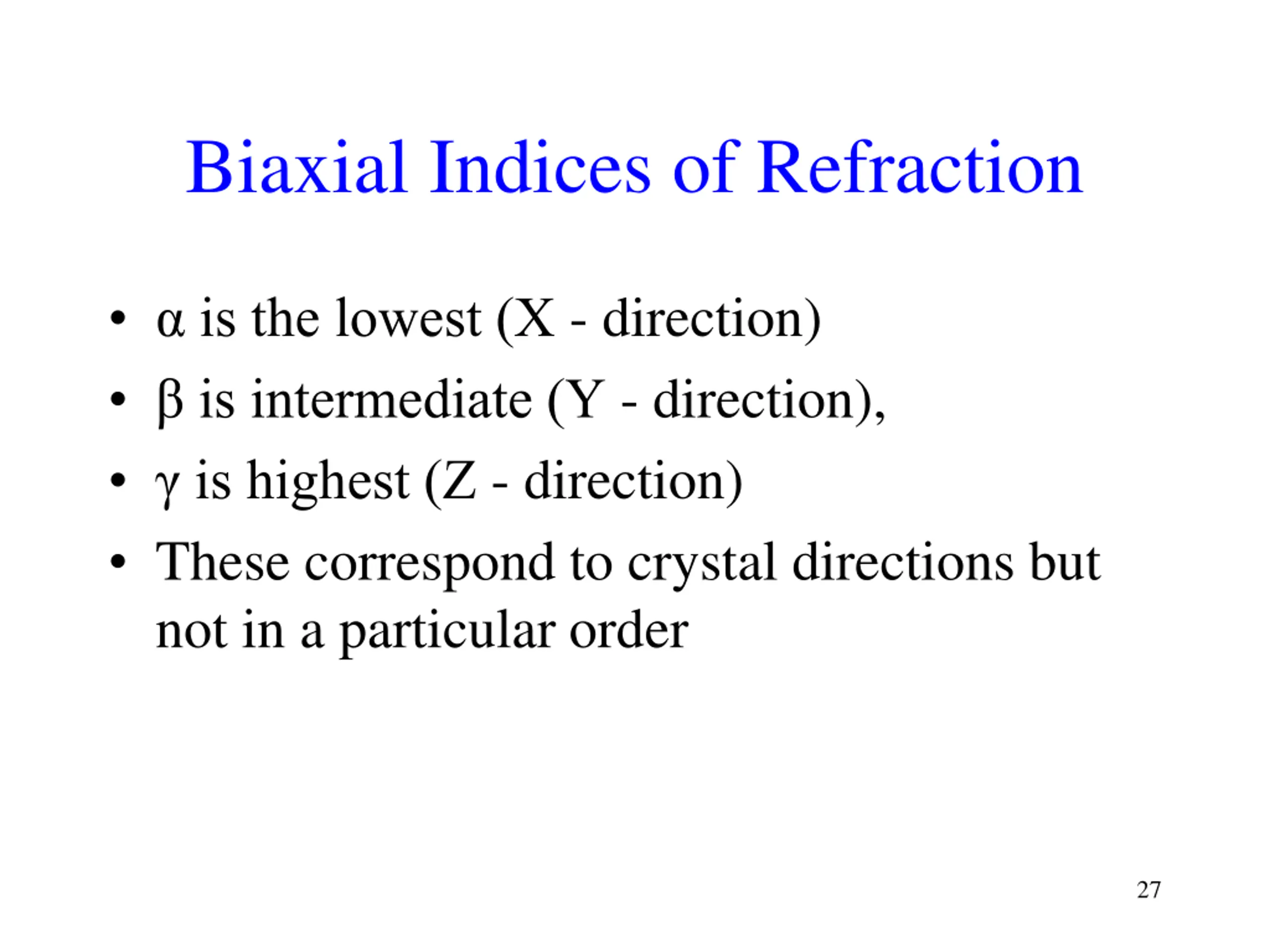 Biaxial Indices of Refraction is the lowest (X - direction) is intermediate (Y - direction), is highest (Z - direction) These correspond to crystal directions but not in a particular order 27