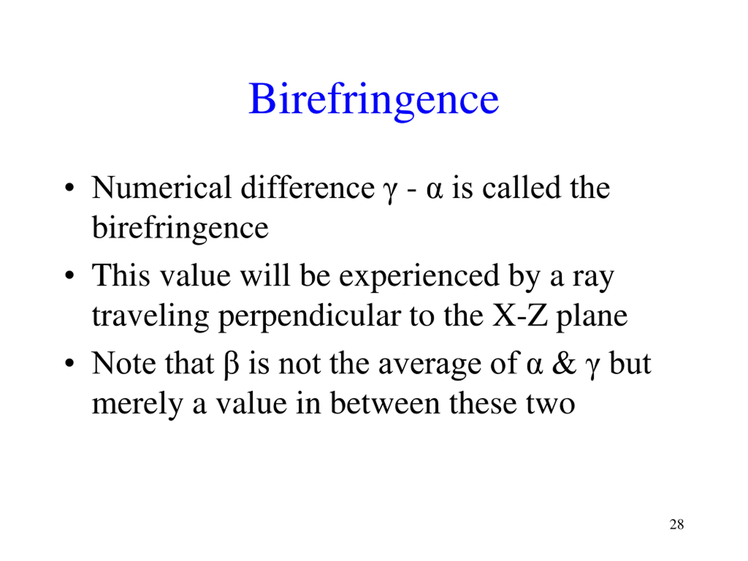 Birefringence Numerical difference - is called the birefringence This value will be experienced by a ray traveling perpendicular to the X-Z plane Note that is not the average of & but merely a value in between these two 28