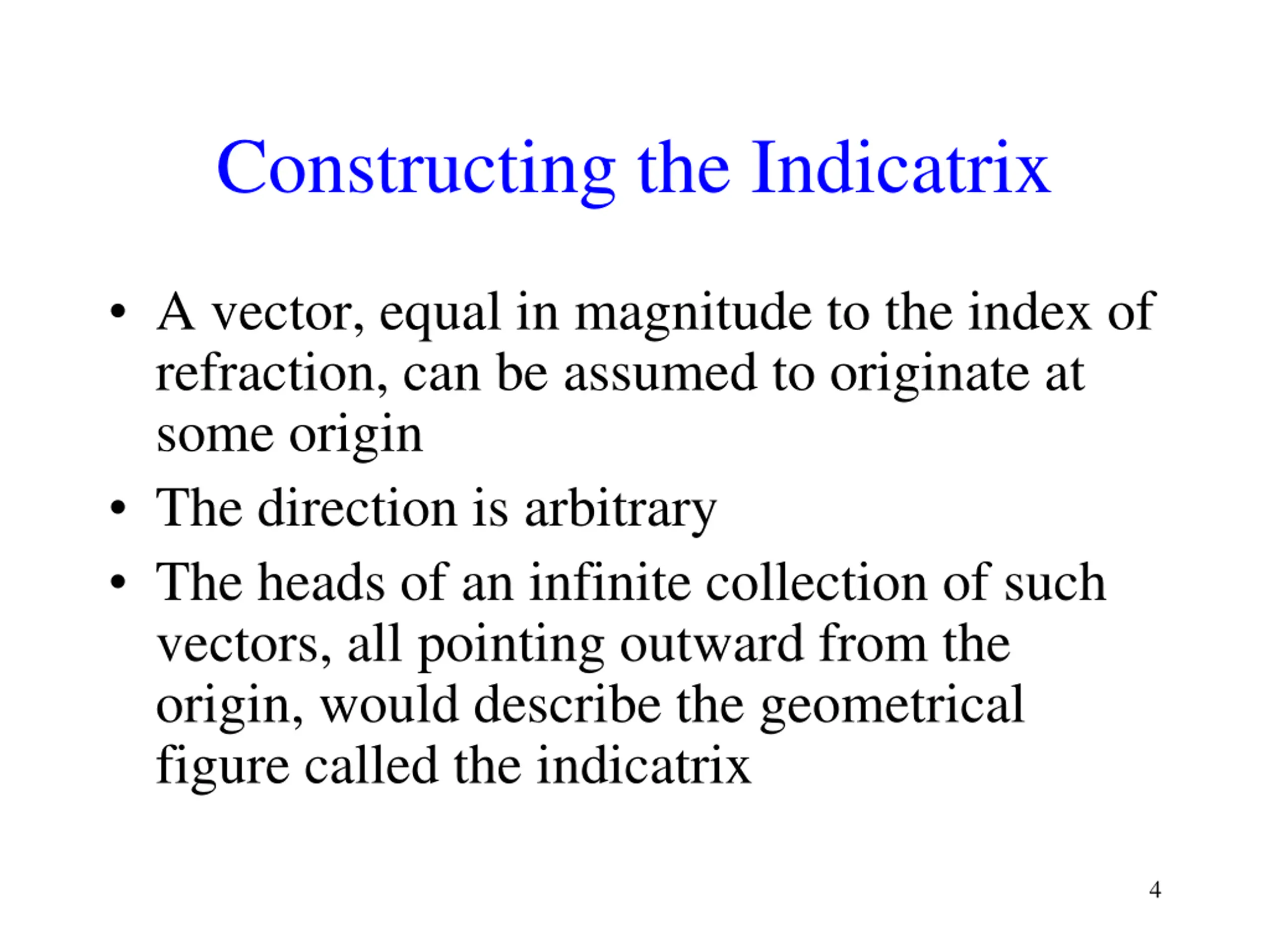 Geometrical Representation The geometrical representation is called an indicatrix The idea of a geometrical representation of the variance of the index of refraction goes back to Sir Lazarus Fletcher (1854-1921) in The Optical Indicatrix and the Transmission of Light in Crystals (London, 1892) 2