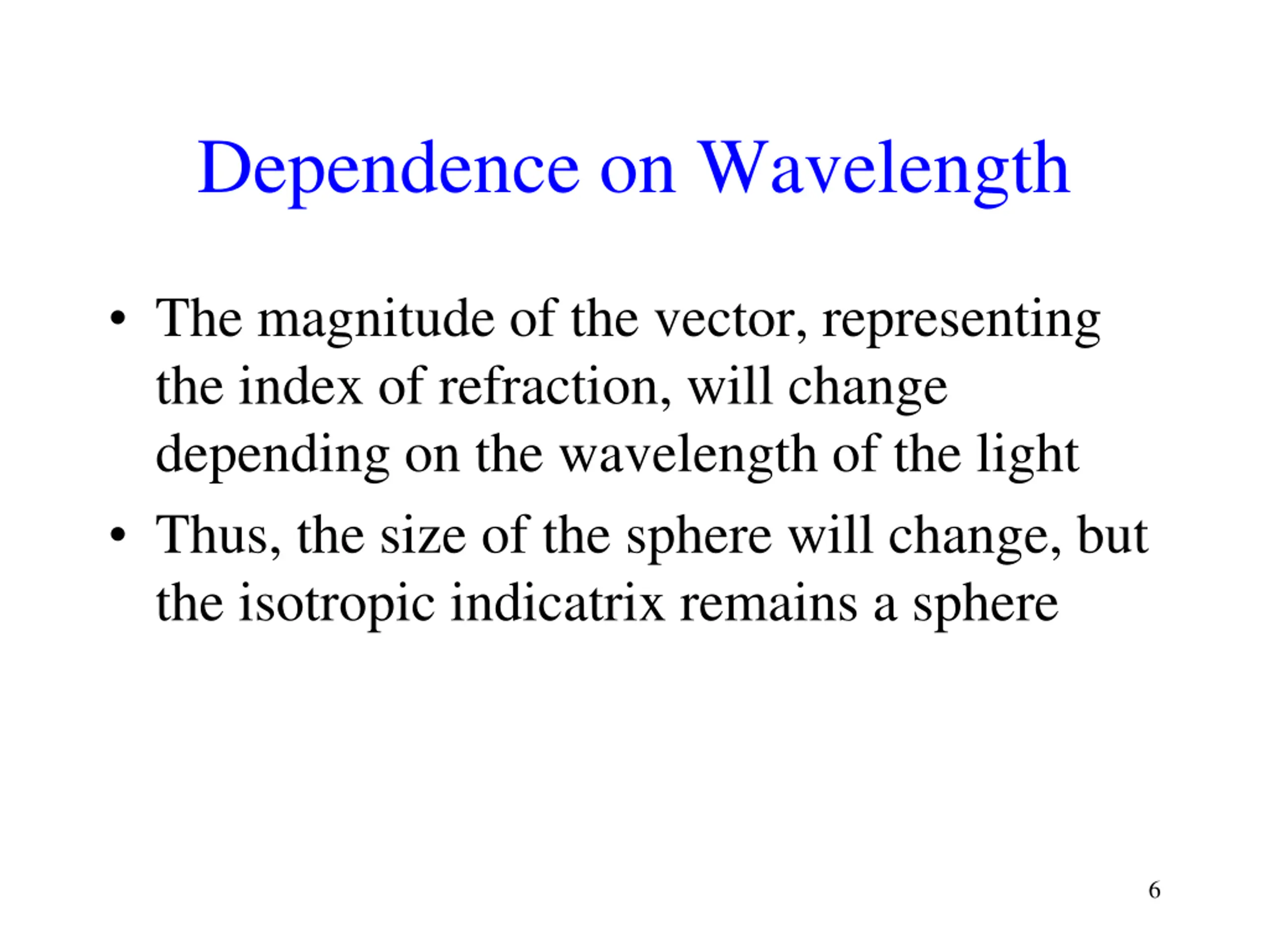 Dependence on Wavelength The magnitude of the vector, representing the index of refraction, will change depending on the wavelength of the light Thus, the size of the sphere will change, but the isotropic indicatrix remains a sphere 6