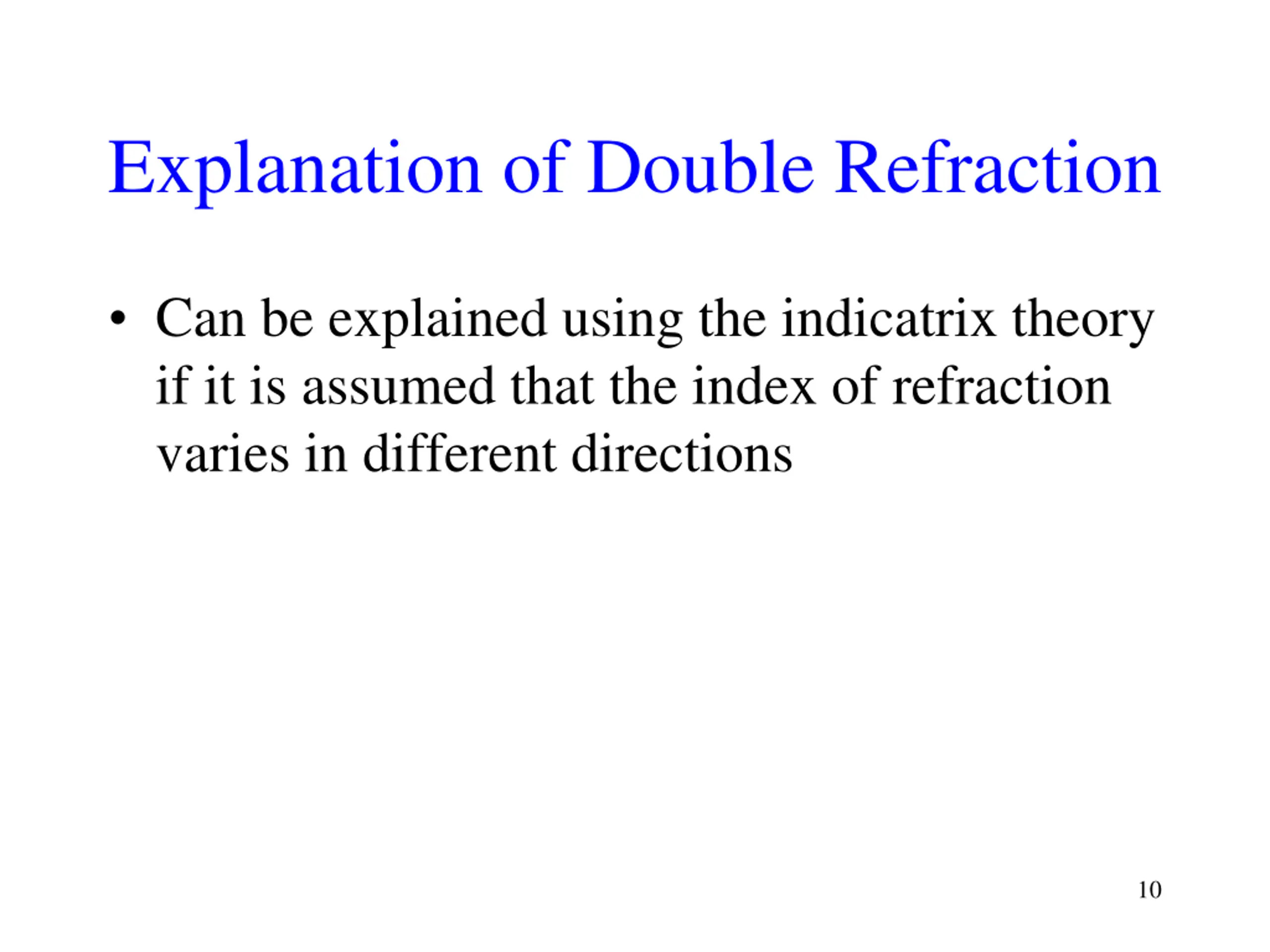 Explanation of Double Refraction Can be explained using the indicatrix theory if it is assumed that the index of refraction varies in different directions 10