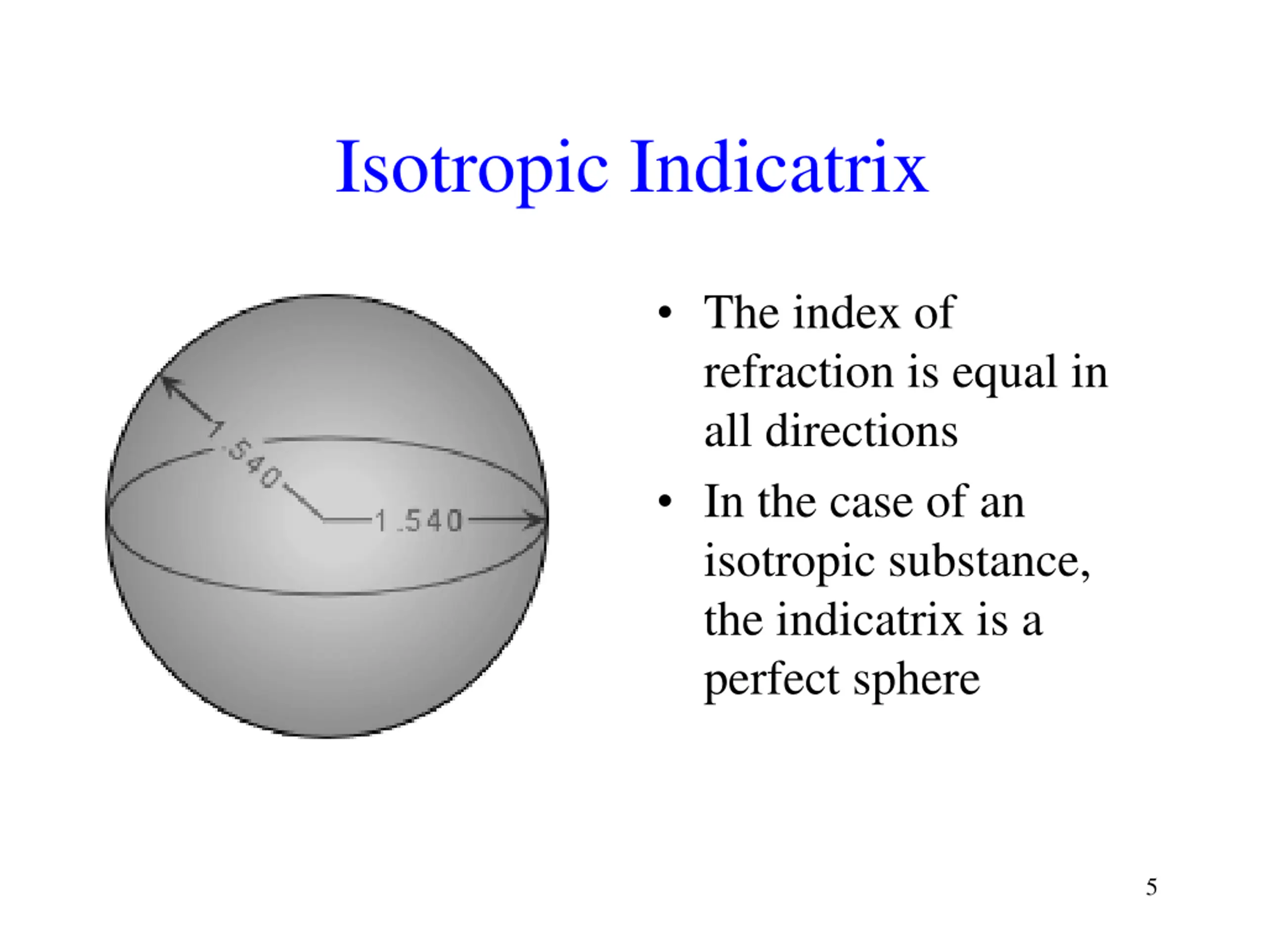 Isotropic Indicatrix The index of refraction is equal in all directions In the case of an isotropic substance, the indicatrix is a perfect sphere 5