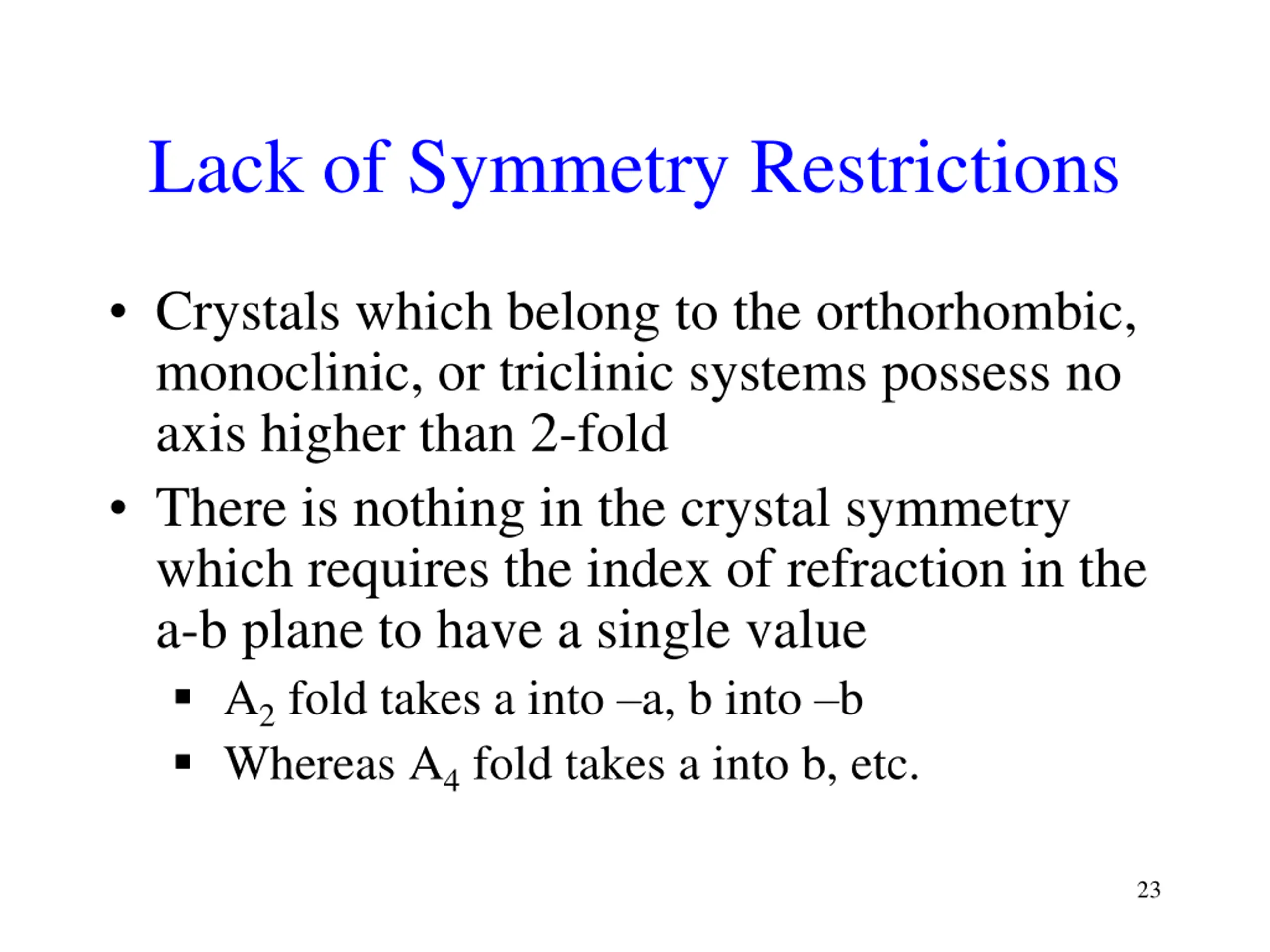Lack of Symmetry Restrictions Crystals which belong to the orthorhombic, monoclinic, or triclinic systems possess no axis higher than 2-fold There is nothing in the crystal symmetry which requires the index of refraction in the a-b plane to have a single value A2 fold takes a into a, b into b Whereas A4 fold takes a into b, etc. 23