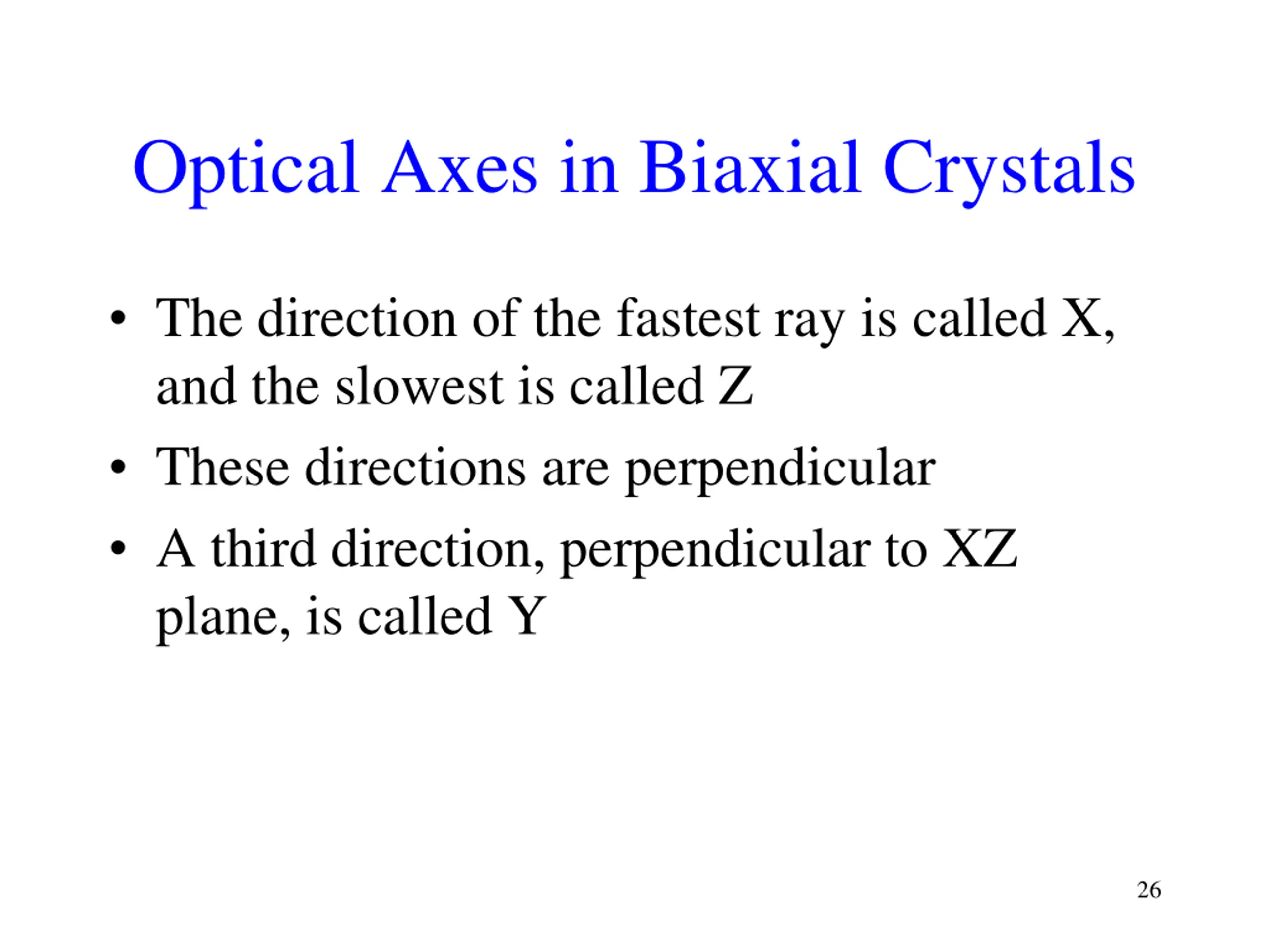 Optical Axes in Biaxial Crystals The direction of the fastest ray is called X, and the slowest is called Z These directions are perpendicular A third direction, perpendicular to XZ plane, is called Y 26