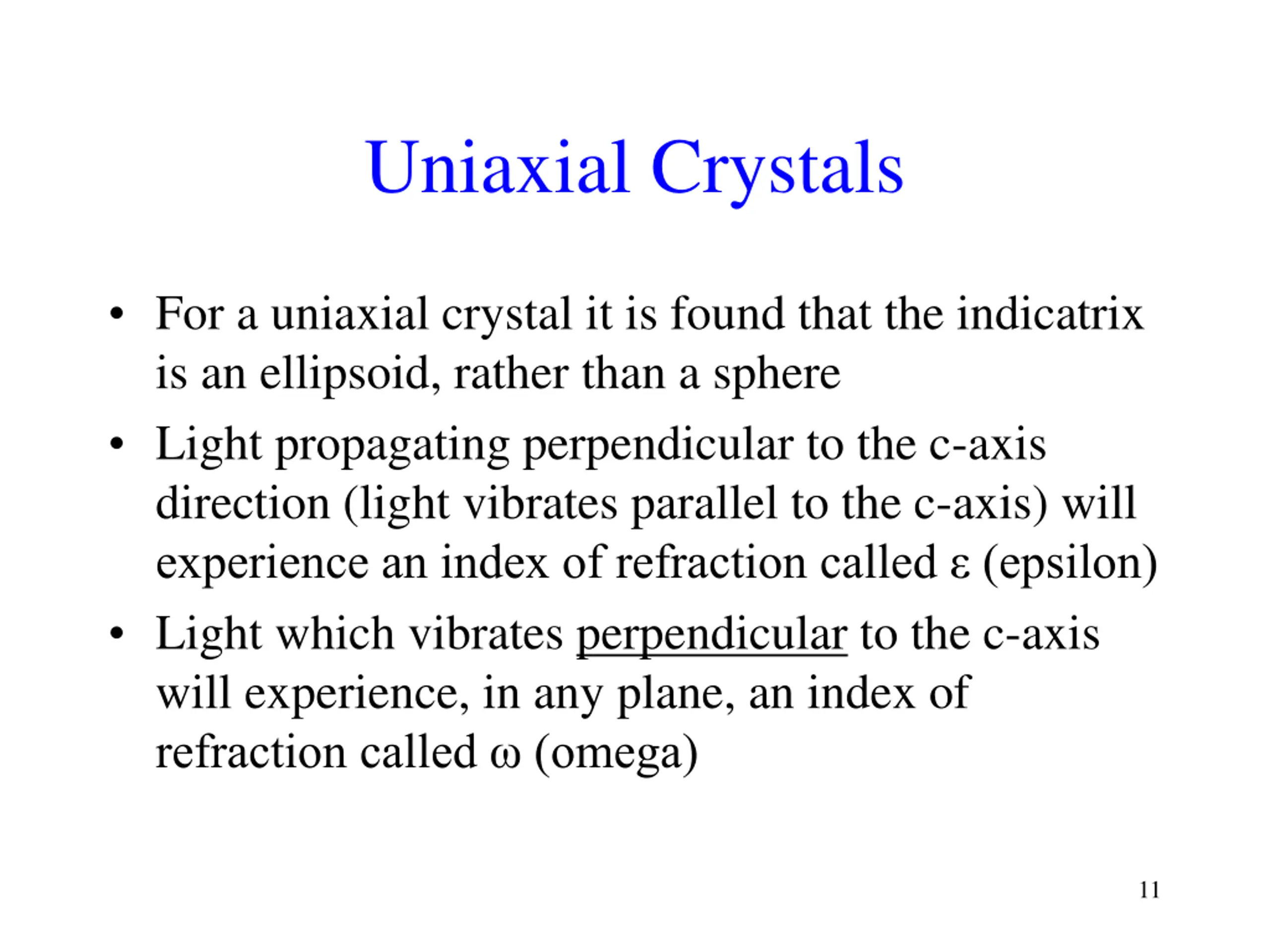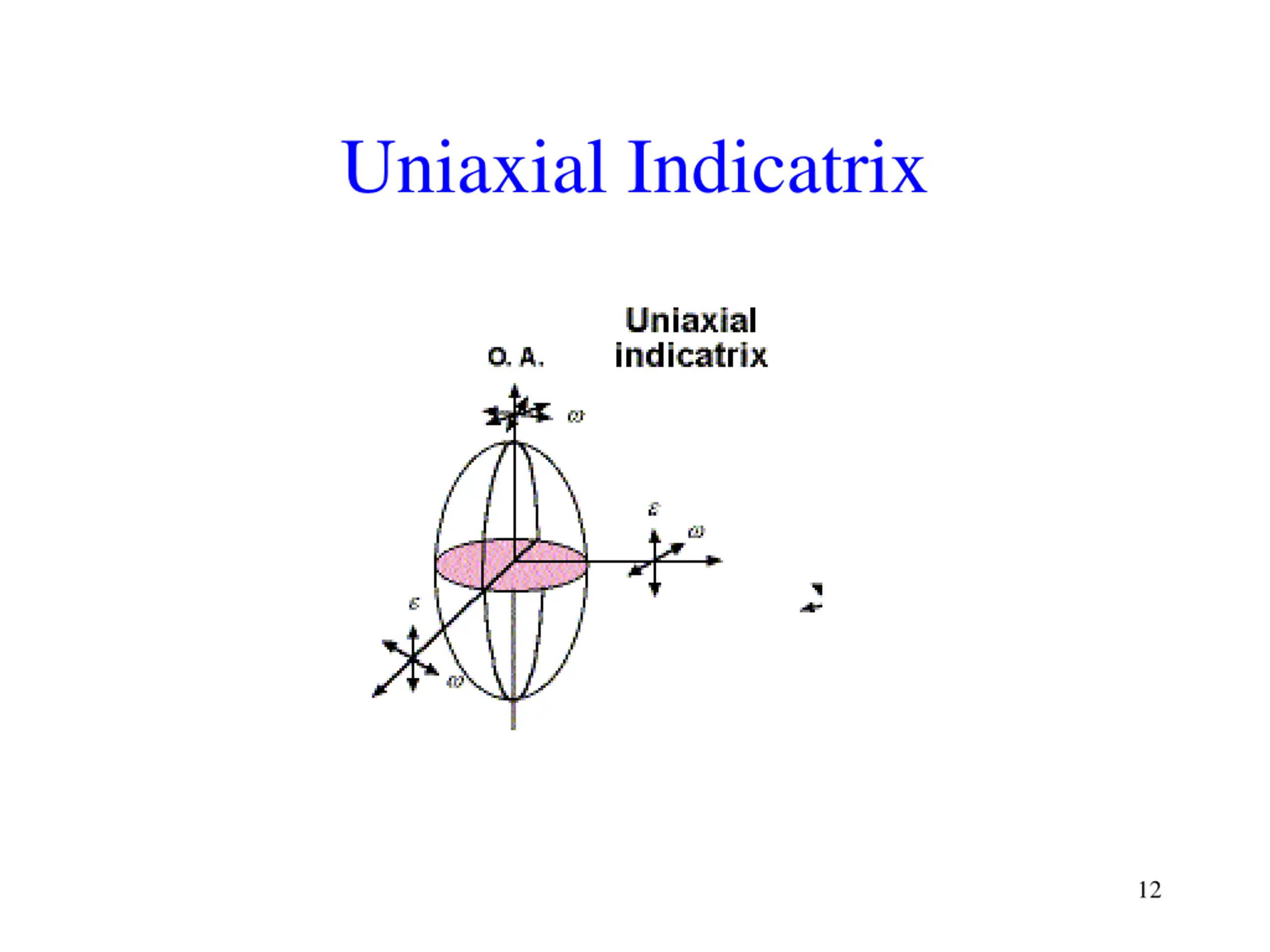Uniaxial Crystals For a uniaxial crystal it is found that the indicatrix is an ellipsoid, rather than a sphere Light propagating perpendicular to the c-axis direction (light vibrates parallel to the c-axis) will experience an index of refraction called (epsilon) Light which vibrates perpendicular to the c-axis will experience, in any plane, an index of refraction called (omega) 11