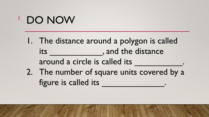 DO NOW 1 1. The distance around a polygon is called its ___________, and the distance around a circle is called its __________. 2. The number of square units covered by a figure is called its _____________.