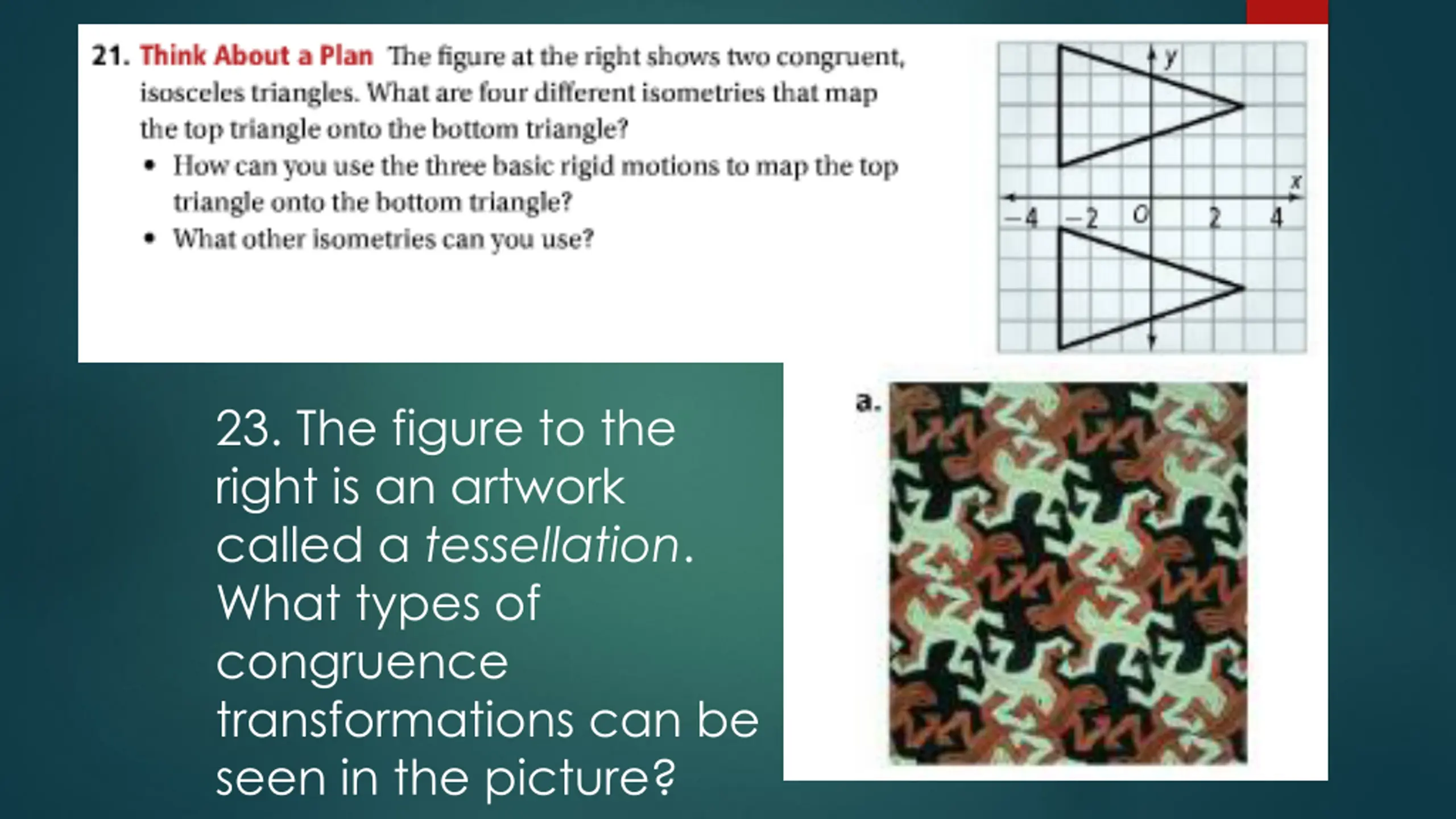 23. The figure to the right is an artwork called a tessellation. What types of congruence transformations can be seen in the picture?