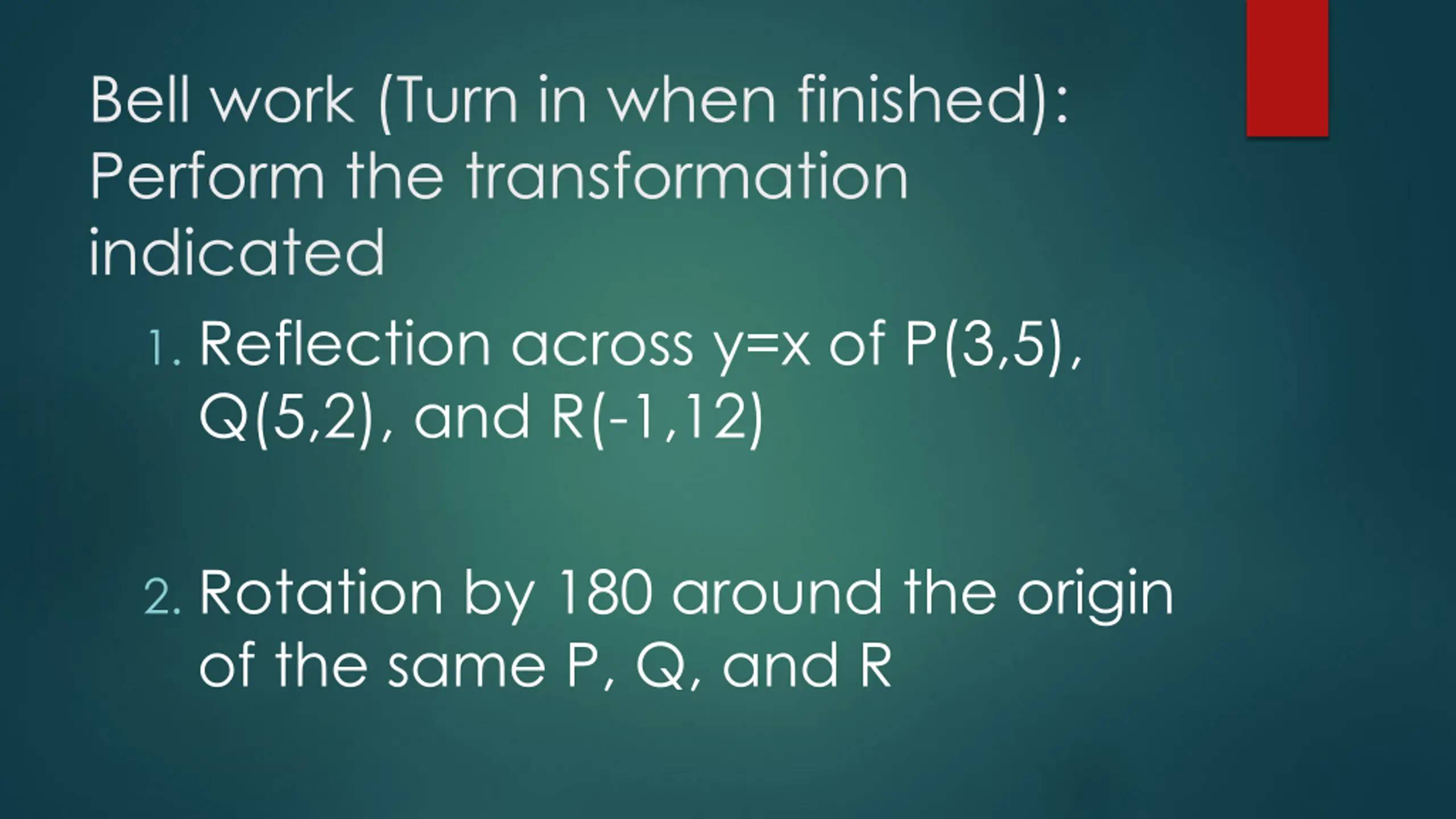 Bell work (Turn in when finished): Perform the transformation indicated 1. Reflection across y=x of P(3,5), Q(5,2), and R(-1,12) 2. Rotation by 180 around the origin of the same P, Q, and R