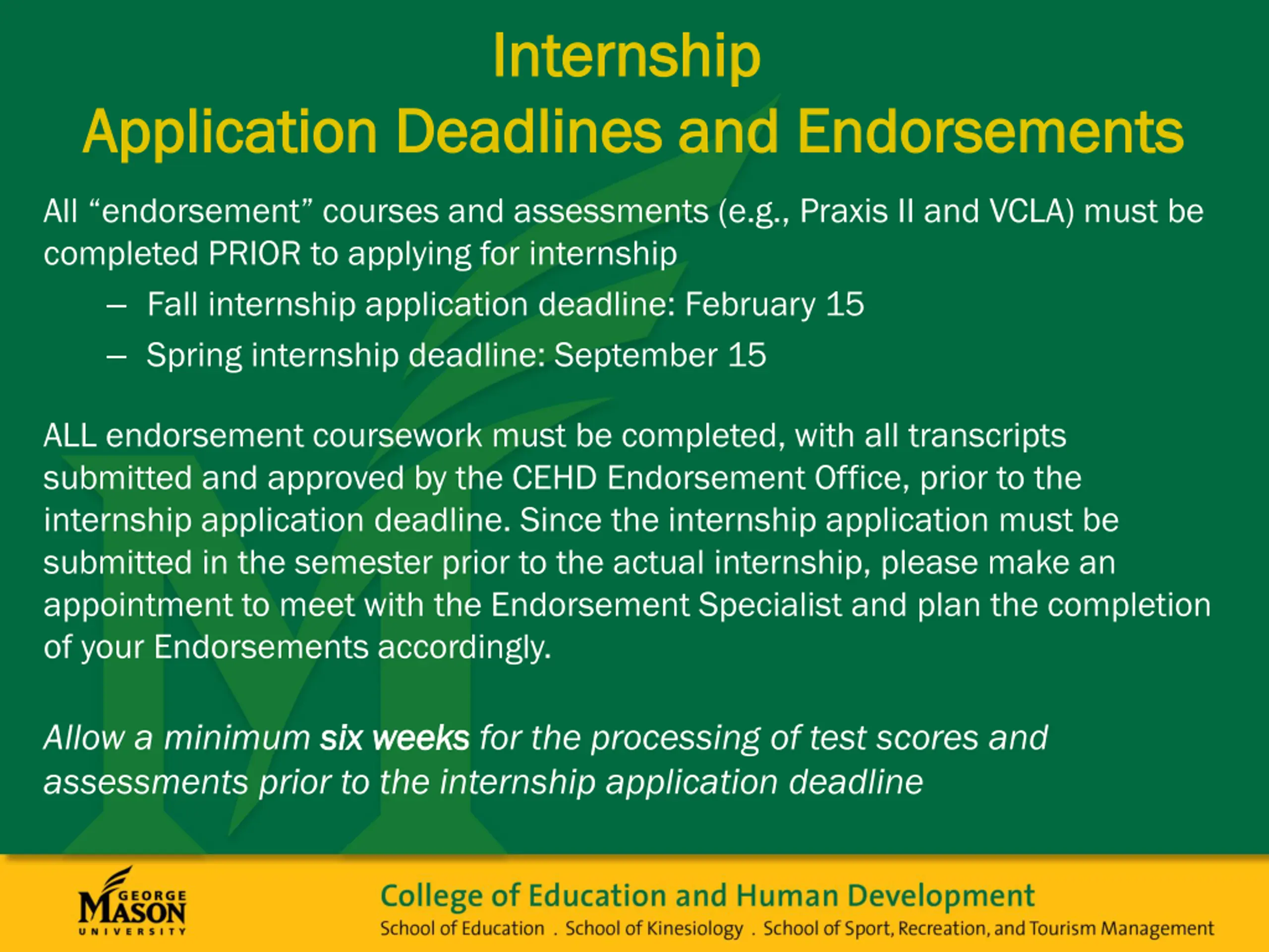 Internship Internship Application Deadlines and Endorsements Application Deadlines and Endorsements All endorsement courses and assessments (e.g., Praxis II and VCLA) must be completed PRIOR to applying for internship Fall internship application deadline: February 15 Spring internship deadline: September 15 ALL endorsement coursework must be completed, with all transcripts submitted and approved by the CEHD Endorsement Office, prior to the internship application deadline. Since the internship application must be submitted in the semester prior to the actual internship, please make an appointment to meet with the Endorsement Specialist and plan the completion of your Endorsements accordingly. Allow a minimum six weeks assessments prior to the internship application deadline six weeks for the processing of test scores and