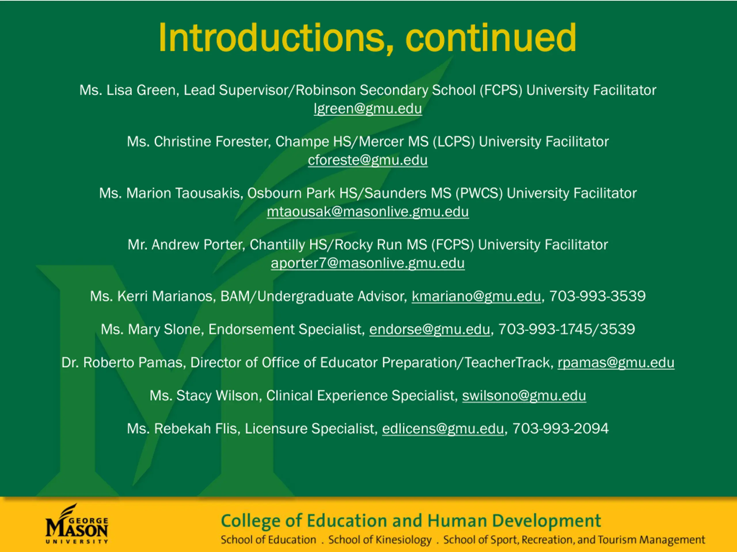 Introductions, continued Introductions, continued Ms. Lisa Green, Lead Supervisor/Robinson Secondary School (FCPS) University Facilitator lgreen@gmu.edu Ms. Christine Forester, Champe HS/Mercer MS (LCPS) University Facilitator cforeste@gmu.edu Ms. Marion Taousakis, Osbourn Park HS/Saunders MS (PWCS) University Facilitator mtaousak@masonlive.gmu.edu Mr. Andrew Porter, Chantilly HS/Rocky Run MS (FCPS) University Facilitator aporter7@masonlive.gmu.edu Ms. Kerri Marianos, BAM/Undergraduate Advisor, kmariano@gmu.edu, 703-993-3539 Ms. Mary Slone, Endorsement Specialist, endorse@gmu.edu, 703-993-1745/3539 Dr. Roberto Pamas, Director of Office of Educator Preparation/TeacherTrack, rpamas@gmu.edu Ms. Stacy Wilson, Clinical Experience Specialist, swilsono@gmu.edu Ms. Rebekah Flis, Licensure Specialist, edlicens@gmu.edu, 703-993-2094