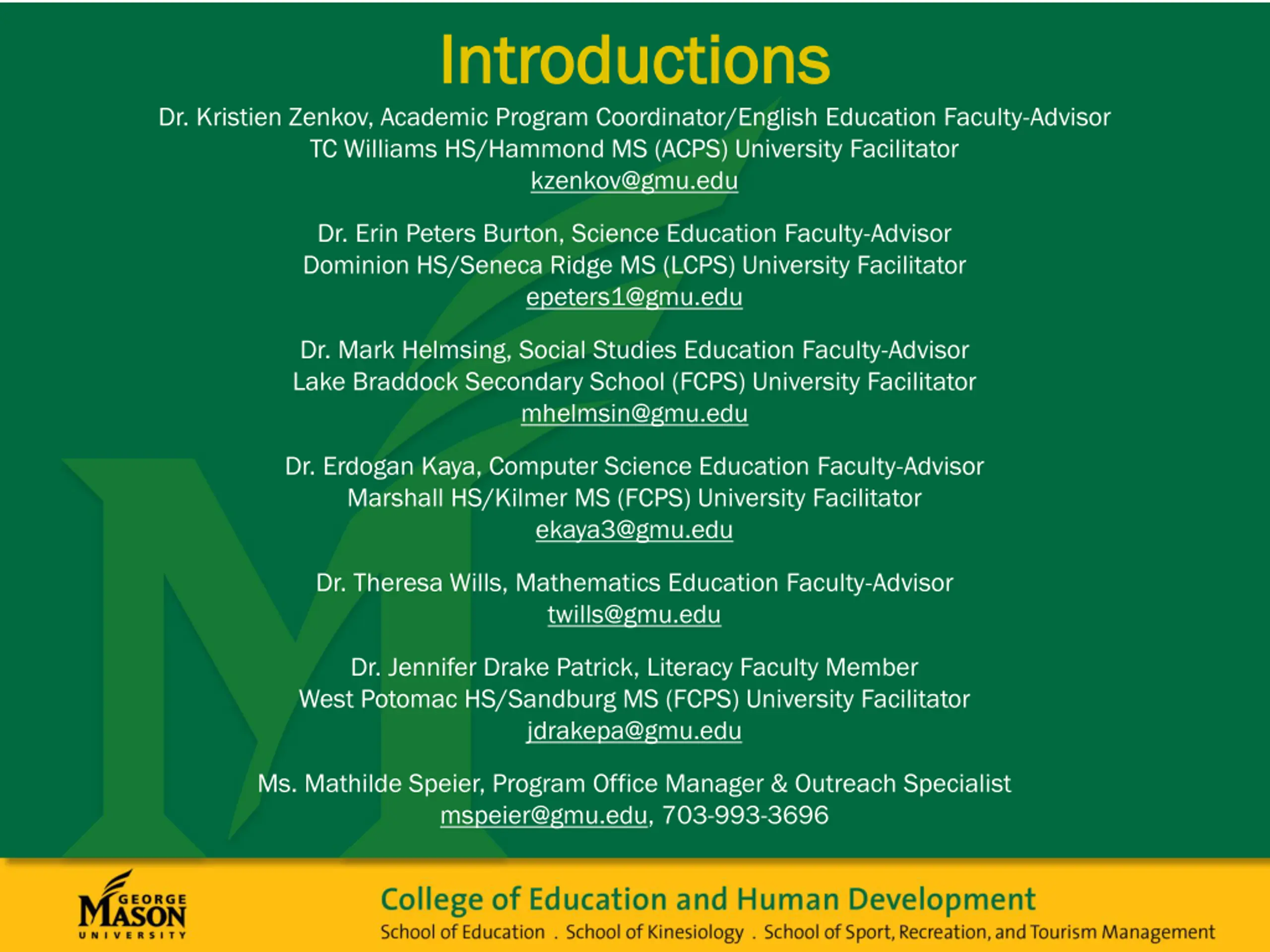 Introductions Introductions Dr. Kristien Zenkov, Academic Program Coordinator/English Education Faculty-Advisor TC Williams HS/Hammond MS (ACPS) University Facilitator kzenkov@gmu.edu Dr. Erin Peters Burton, Science Education Faculty-Advisor Dominion HS/Seneca Ridge MS (LCPS) University Facilitator epeters1@gmu.edu Dr. Mark Helmsing, Social Studies Education Faculty-Advisor Lake Braddock Secondary School (FCPS) University Facilitator mhelmsin@gmu.edu Dr. Erdogan Kaya, Computer Science Education Faculty-Advisor Marshall HS/Kilmer MS (FCPS) University Facilitator ekaya3@gmu.edu Dr. Theresa Wills, Mathematics Education Faculty-Advisor twills@gmu.edu Dr. Jennifer Drake Patrick, Literacy Faculty Member West Potomac HS/Sandburg MS (FCPS) University Facilitator jdrakepa@gmu.edu Ms. Mathilde Speier, Program Office Manager & Outreach Specialist mspeier@gmu.edu, 703-993-3696