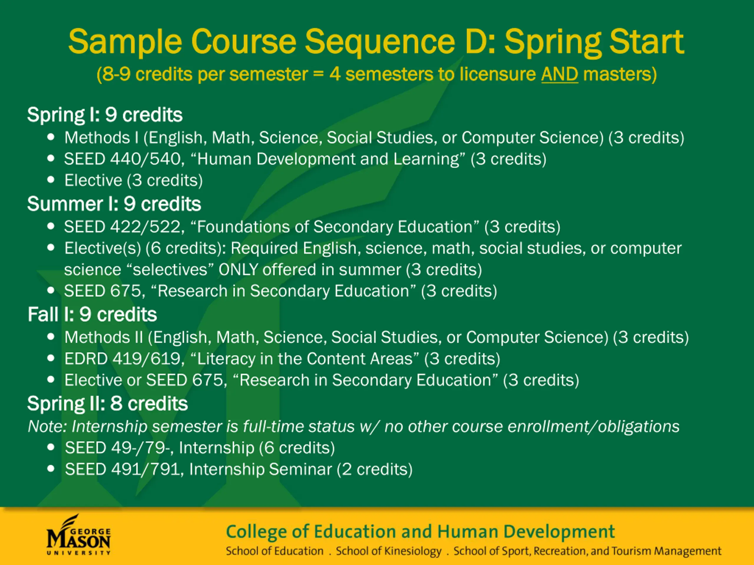 Sample Course Sequence C: Spring Start Sample Course Sequence C: Spring Start (6 (6- -9 credits per semester = 4 semesters to licensure, 5 semesters to masters) 9 credits per semester = 4 semesters to licensure, 5 semesters to masters) Spring I: 6 credits Spring I: 6 credits Methods I (English, Math, Science, Social Studies, Computer Science) (3 credits) SEED 440/540, Human Development and Learning (3 credits) Summer I: 6 Summer I: 6- -9 credits 9 credits SEED 422/522, Foundations of Secondary Education (3 credits) Elective(s) (3 credits): Required English, science, math, social studies, computer science selectives ONLY offered in summer (3 credits) Fall I: 6 credits Fall I: 6 credits Methods II (English, Math, Science, Social Studies, or Computer Science) (3 credits) EDRD 419/619, Literacy in the Content Areas (3 credits) Spring II: 8 credits Spring II: 8 credits Note: Internship semester is full-time status w/ no other course enrollment/obligations SEED 49-/79-, Internship (6 credits) SEED 491/791, Internship Seminar (2 credits) Summer II: 3 Summer II: 3- -9 credits 9 credits Elective(s) (3-6 credits) SEED 675, Research in Secondary Education (3 credits)