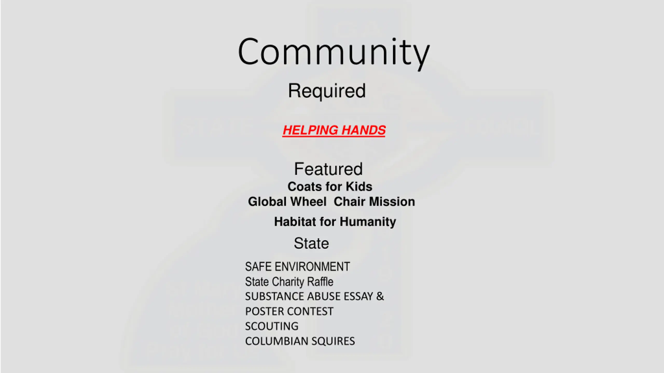 Community Required HELPING HANDS Featured Coats for Kids Global Wheel Chair Mission Habitat for Humanity State SAFE ENVIRONMENT State Charity Raffle SUBSTANCE ABUSE ESSAY & POSTER CONTEST SCOUTING COLUMBIAN SQUIRES