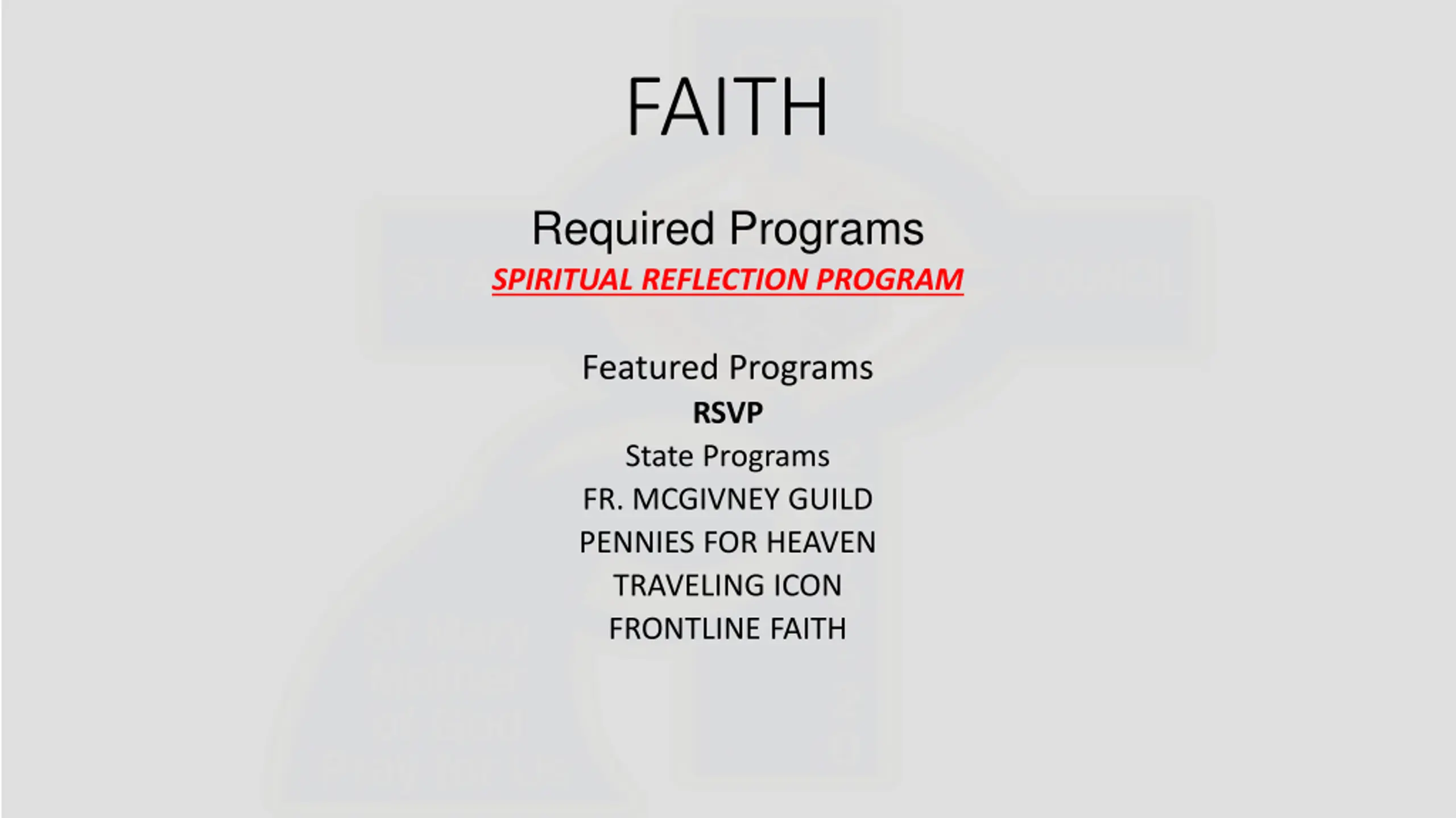 FAITH Required Programs SPIRITUAL REFLECTION PROGRAM Featured Programs RSVP State Programs FR. MCGIVNEY GUILD PENNIES FOR HEAVEN TRAVELING ICON FRONTLINE FAITH