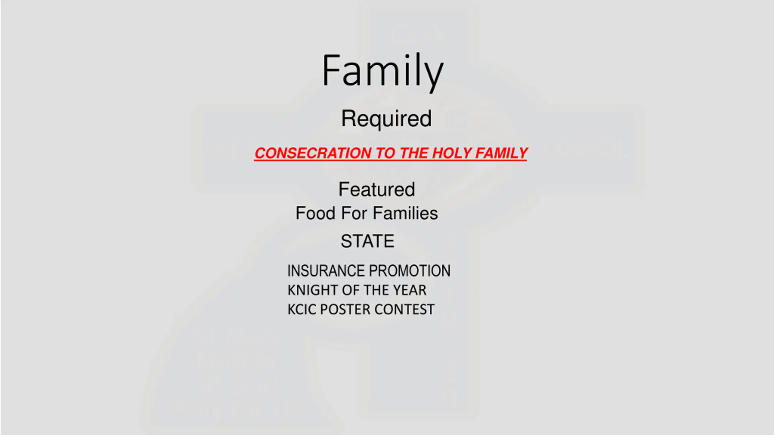 Family Required CONSECRATION TO THE HOLY FAMILY Featured Food For Families STATE INSURANCE PROMOTION KNIGHT OF THE YEAR KCIC POSTER CONTEST