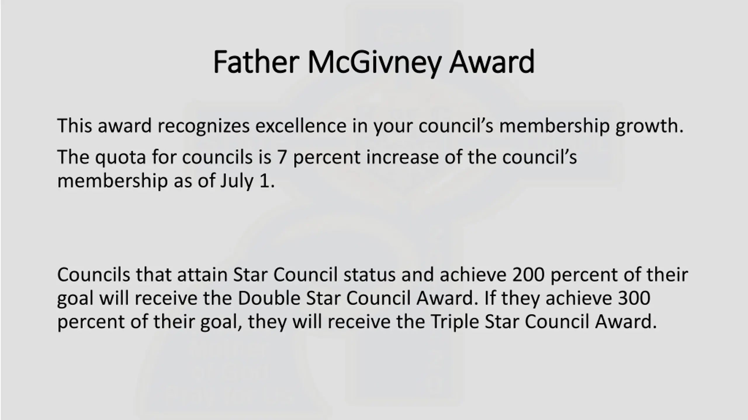 Father McGivney Award Father McGivney Award This award recognizes excellence in your council s membership growth. The quota for councils is 7 percent increase of the council s membership as of July 1. Councils that attain Star Council status and achieve 200 percent of their goal will receive the Double Star Council Award. If they achieve 300 percent of their goal, they will receive the Triple Star Council Award.