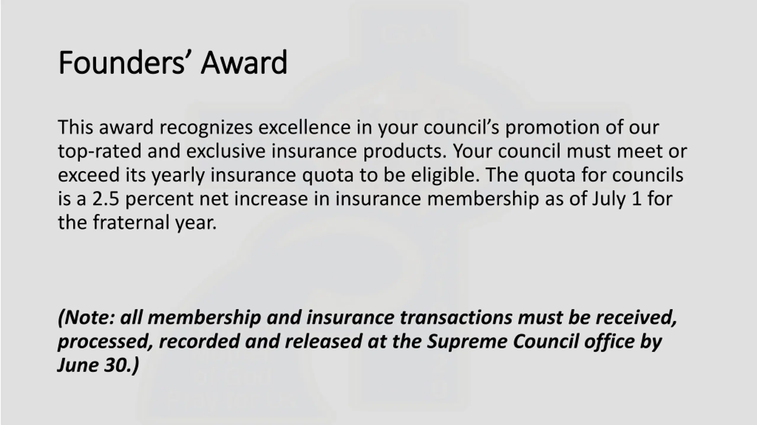 Founders Award Founders Award This award recognizes excellence in your council s promotion of our top-rated and exclusive insurance products. Your council must meet or exceed its yearly insurance quota to be eligible. The quota for councils is a 2.5 percent net increase in insurance membership as of July 1 for the fraternal year. (Note: all membership and insurance transactions must be received, processed, recorded and released at the Supreme Council office by June 30.)