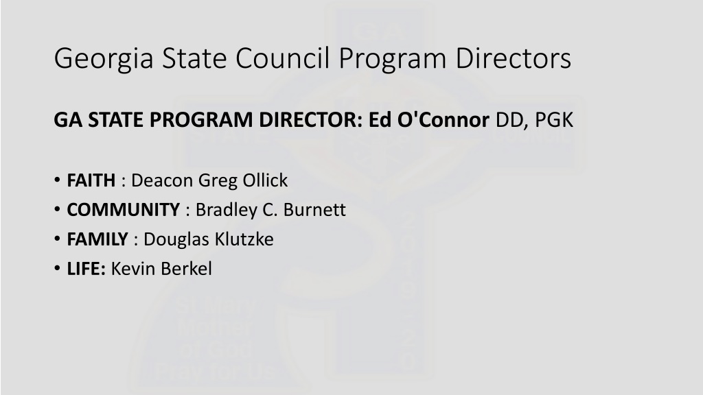 Georgia State Council Program Directors GA STATE PROGRAM DIRECTOR: Ed O'Connor DD, PGK FAITH : Deacon Greg Ollick COMMUNITY : Bradley C. Burnett FAMILY : Douglas Klutzke LIFE: Kevin Berkel