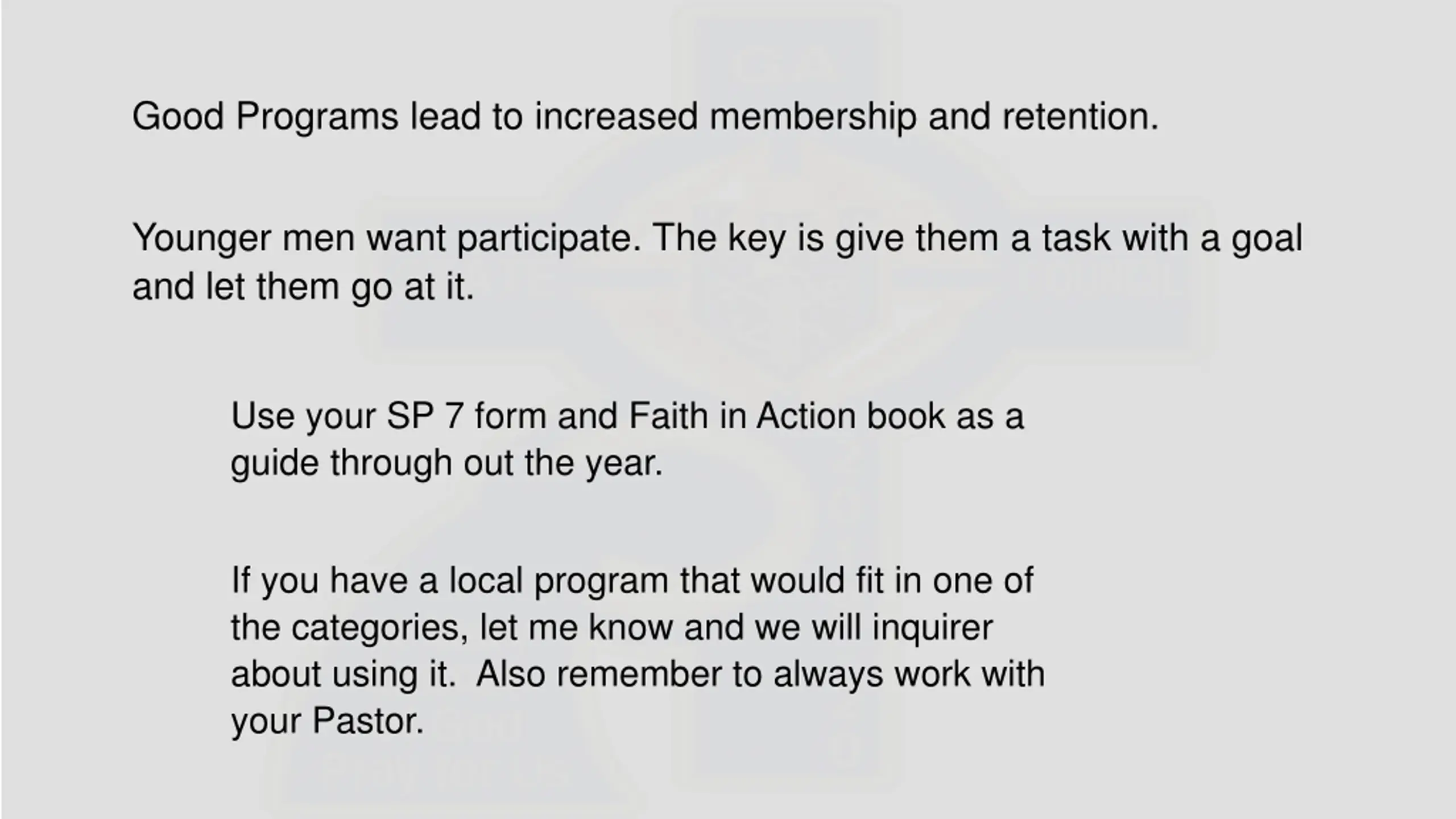 Good Programs lead to increased membership and retention. Younger men want participate. The key is give them a task with a goal and let them go at it. Use your SP 7 form and Faith in Action book as a guide through out the year. If you have a local program that would fit in one of the categories, let me know and we will inquirer about using it. Also remember to always work with your Pastor.