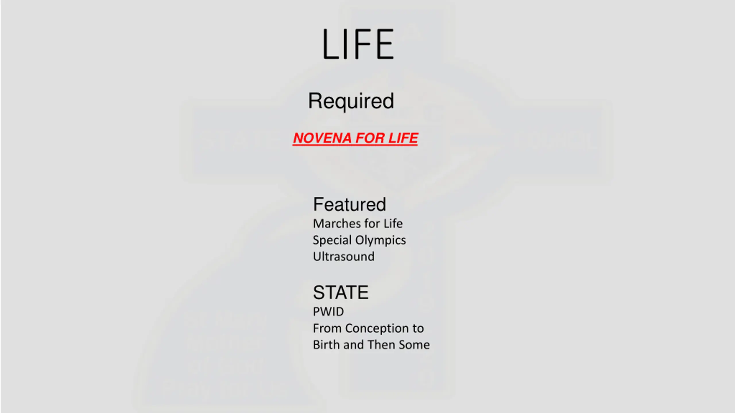 LIFE Required NOVENA FOR LIFE Featured Marches for Life Special Olympics Ultrasound STATE PWID From Conception to Birth and Then Some