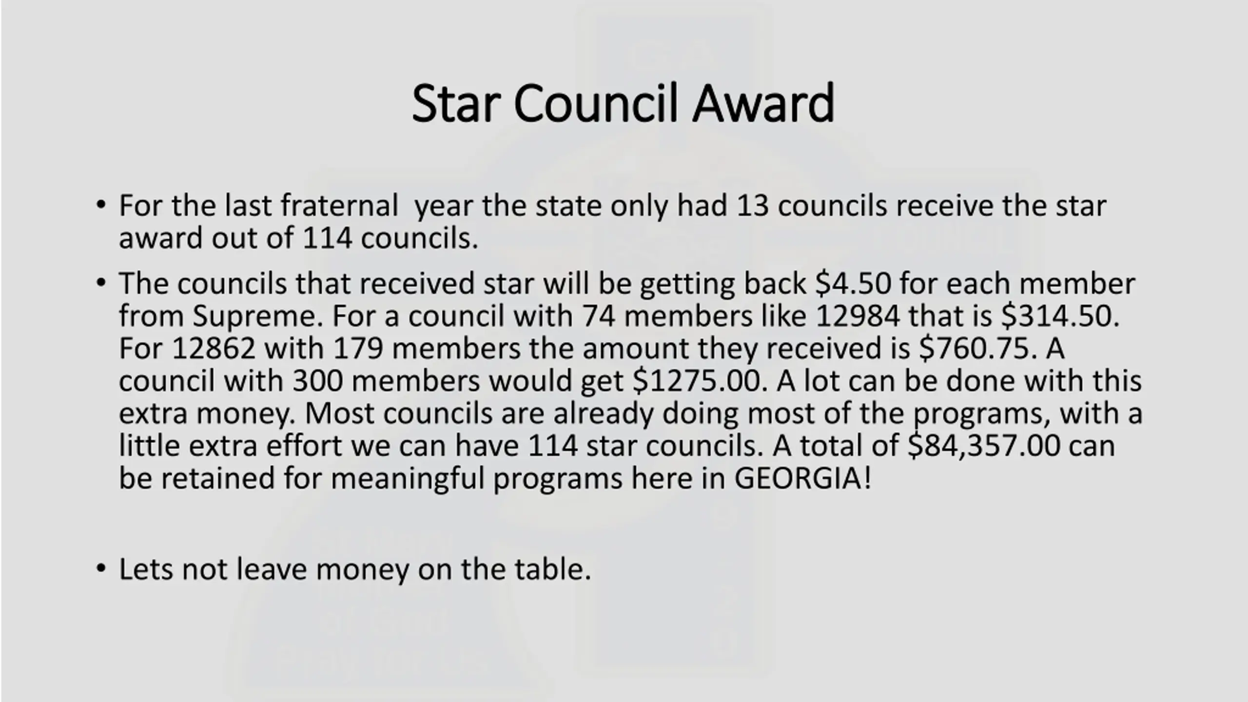 Star Council Award Star Council Award For the last fraternal year the state only had 13 councils receive the star award out of 114 councils. The councils that received star will be getting back $4.50 for each member from Supreme. For a council with 74 members like 12984 that is $314.50. For 12862 with 179 members the amount they received is $760.75. A council with 300 members would get $1275.00. A lot can be done with this extra money. Most councils are already doing most of the programs, with a little extra effort we can have 114 star councils. A total of $84,357.00 can be retained for meaningful programs here in GEORGIA! Lets not leave money on the table.