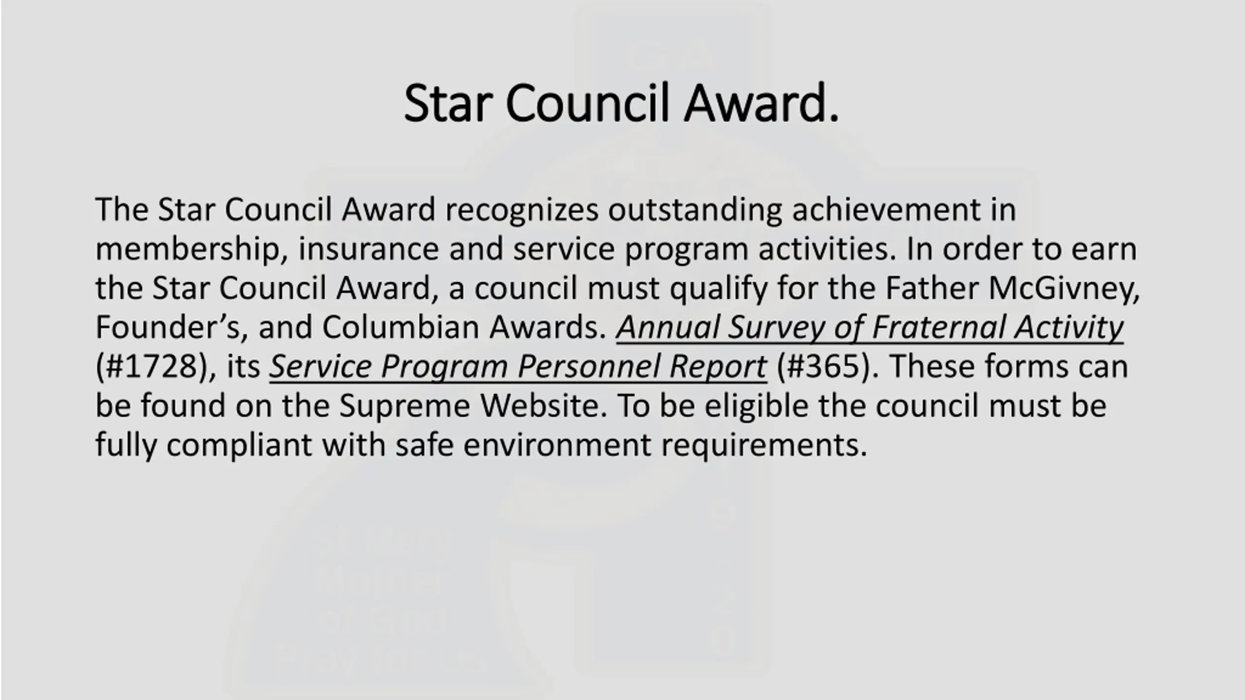 Star Council Award. Star Council Award. The Star Council Award recognizes outstanding achievement in membership, insurance and service program activities. In order to earn the Star Council Award, a council must qualify for the Father McGivney, Founder s, and Columbian Awards. Annual Survey of Fraternal Activity (#1728), its Service Program Personnel Report (#365). These forms can be found on the Supreme Website. To be eligible the council must be fully compliant with safe environment requirements.