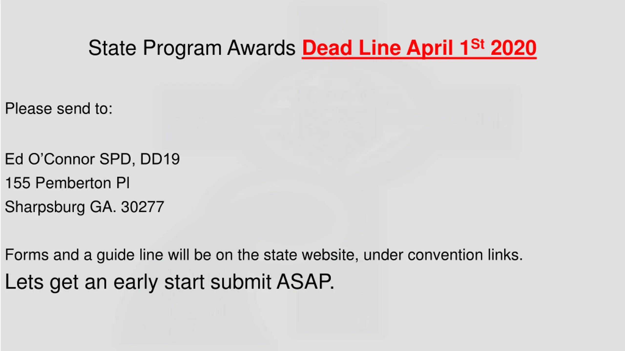 State Program Awards Dead Line April 1St 2020 Please send to: Ed O Connor SPD, DD19 155 Pemberton Pl Sharpsburg GA. 30277 Forms and a guide line will be on the state website, under convention links. Lets get an early start submit ASAP.
