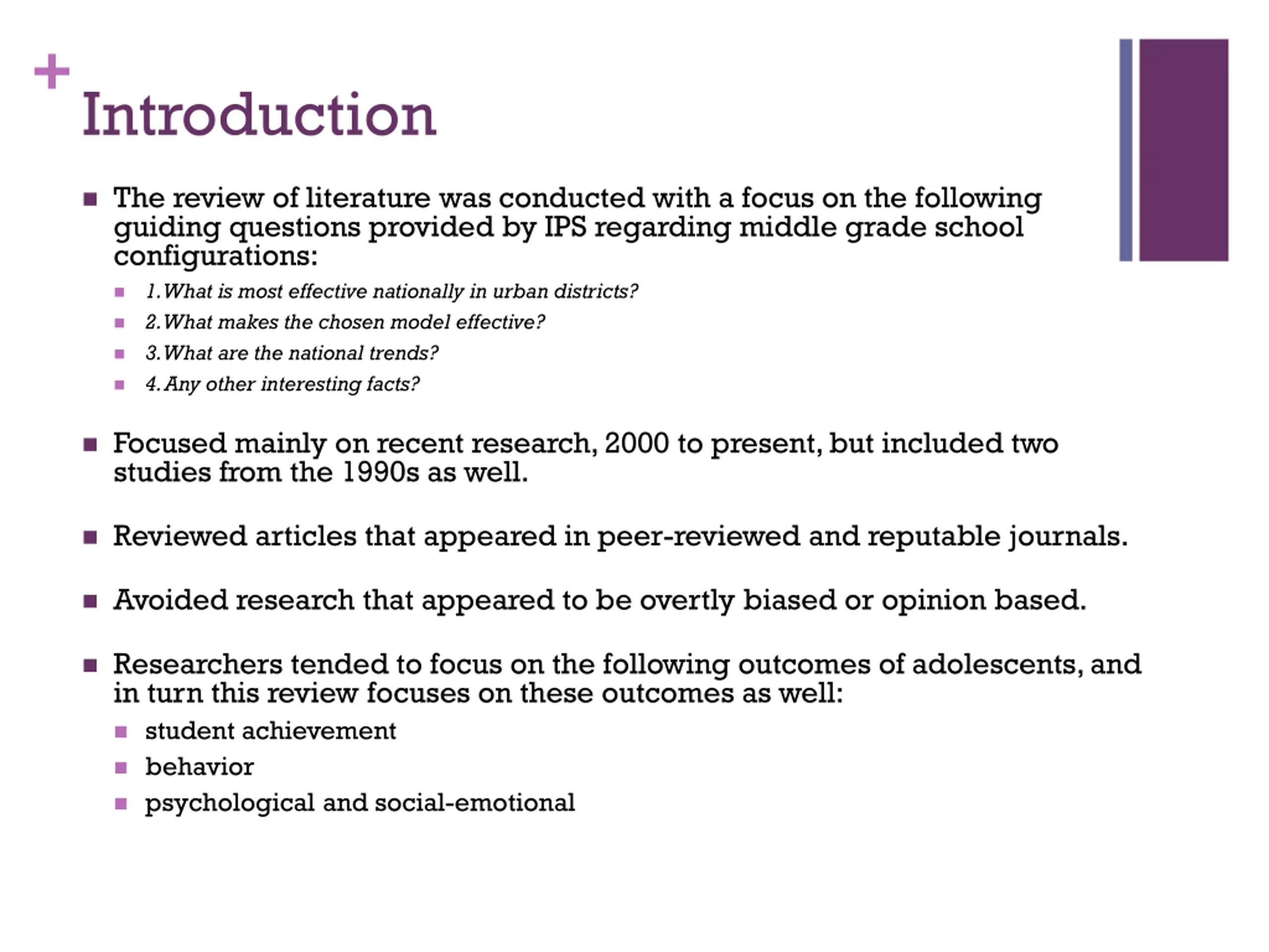 +Introduction The review of literature was conducted with a focus on the following guiding questions provided by IPS regarding middle grade school configurations: 1. What is most effective nationally in urban districts? 2. What makes the chosen model effective? 3. What are the national trends? 4. Any other interesting facts? Focused mainly on recent research, 2000 to present, but included two studies from the 1990s as well. Reviewed articles that appeared in peer-reviewed and reputable journals. Avoided research that appeared to be overtly biased or opinion based. Researchers tended to focus on the following outcomes of adolescents, and in turn this review focuses on these outcomes as well: student achievement behavior psychological and social-emotional