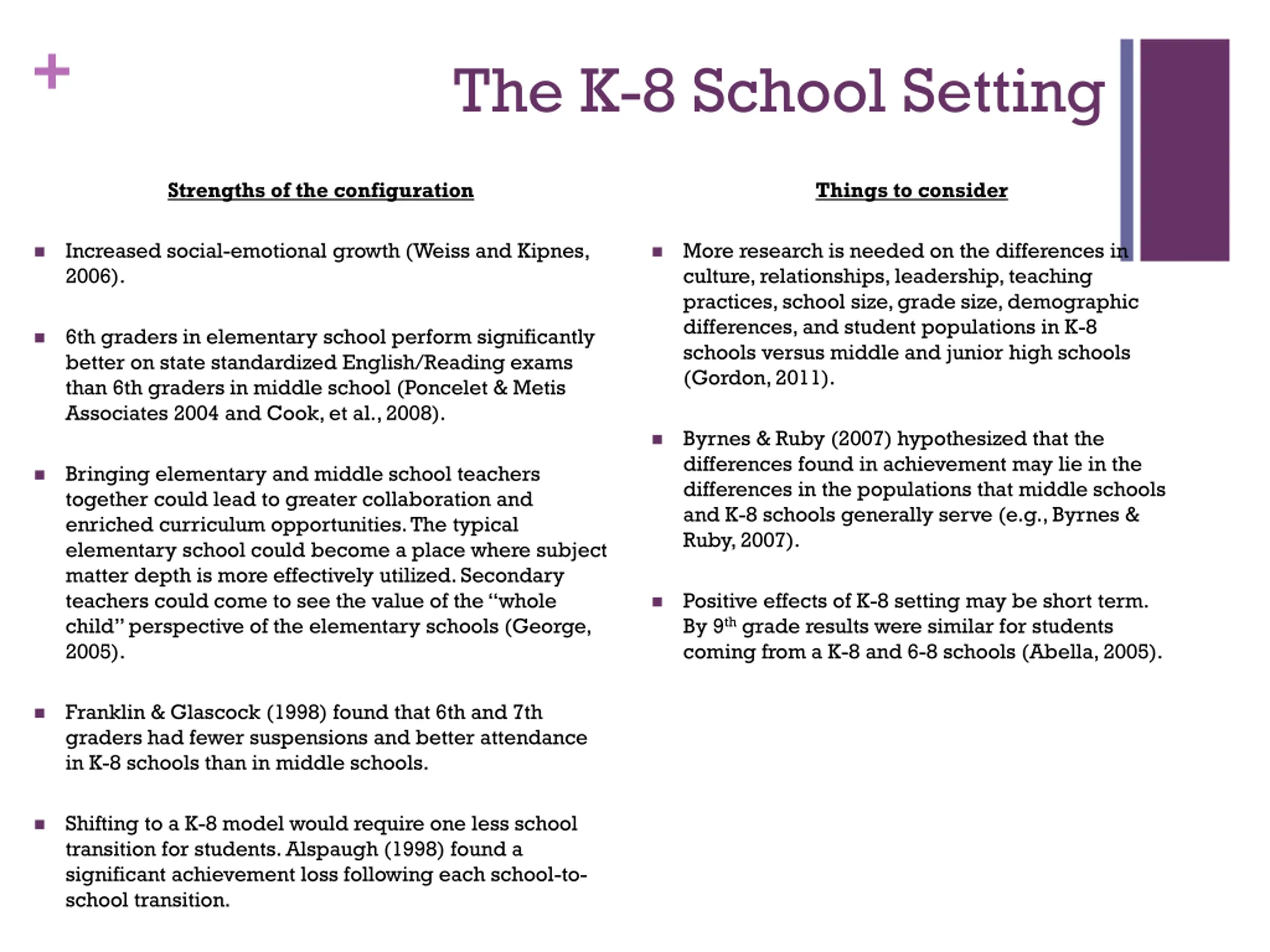 + The K-8 School Setting Strengths of the configuration Things to consider Increased social-emotional growth (Weiss and Kipnes, 2006). More research is needed on the differences in culture, relationships, leadership, teaching practices, school size, grade size, demographic differences, and student populations in K-8 schools versus middle and junior high schools (Gordon, 2011). 6th graders in elementary school perform significantly better on state standardized English/Reading exams than 6th graders in middle school (Poncelet & Metis Associates 2004 and Cook, et al., 2008). Byrnes & Ruby (2007) hypothesized that the differences found in achievement may lie in the differences in the populations that middle schools and K-8 schools generally serve (e.g., Byrnes & Ruby, 2007). Bringing elementary and middle school teachers together could lead to greater collaboration and enriched curriculum opportunities. The typical elementary school could become a place where subject matter depth is more effectively utilized. Secondary teachers could come to see the value of the whole child perspective of the elementary schools (George, 2005). Positive effects of K-8 setting may be short term. By 9th grade results were similar for students coming from a K-8 and 6-8 schools (Abella, 2005). Franklin & Glascock (1998) found that 6th and 7th graders had fewer suspensions and better attendance in K-8 schools than in middle schools. Shifting to a K-8 model would require one less school transition for students. Alspaugh (1998) found a significant achievement loss following each school-to- school transition.
