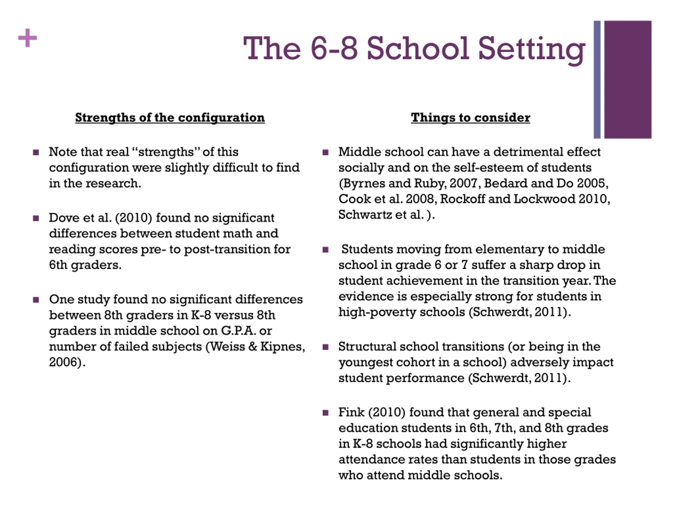 + The 6-8 School Setting Strengths of the configuration Things to consider Note that real strengths of this configuration were slightly difficult to find in the research. Middle school can have a detrimental effect socially and on the self-esteem of students (Byrnes and Ruby, 2007, Bedard and Do 2005, Cook et al. 2008, Rockoff and Lockwood 2010, Schwartz et al. ). Dove et al. (2010) found no significant differences between student math and reading scores pre- to post-transition for 6th graders. Students moving from elementary to middle school in grade 6 or 7 suffer a sharp drop in student achievement in the transition year. The evidence is especially strong for students in high-poverty schools (Schwerdt, 2011). One study found no significant differences between 8th graders in K-8 versus 8th graders in middle school on G.P.A. or number of failed subjects (Weiss & Kipnes, 2006). Structural school transitions (or being in the youngest cohort in a school) adversely impact student performance (Schwerdt, 2011). Fink (2010) found that general and special education students in 6th, 7th, and 8th grades in K-8 schools had significantly higher attendance rates than students in those grades who attend middle schools.