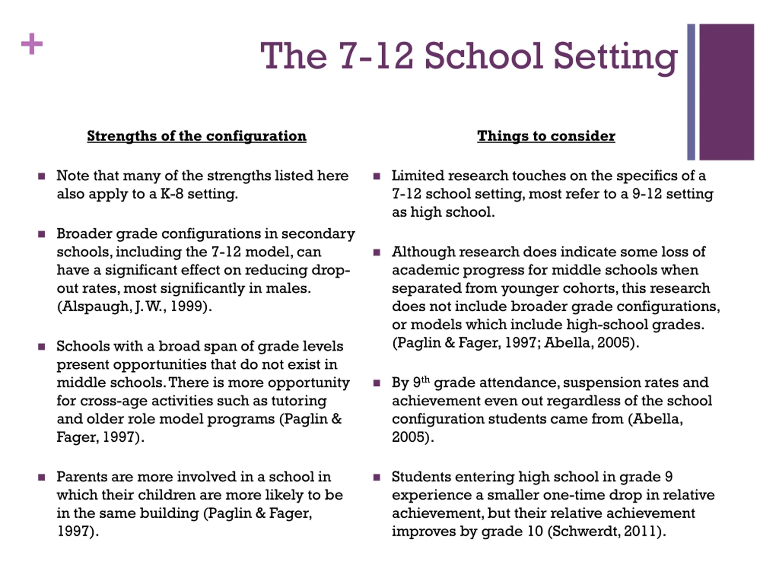 + The 7-12 School Setting Strengths of the configuration Things to consider Note that many of the strengths listed here also apply to a K-8 setting. Limited research touches on the specifics of a 7-12 school setting, most refer to a 9-12 setting as high school. Broader grade configurations in secondary schools, including the 7-12 model, can have a significant effect on reducing drop- out rates, most significantly in males. (Alspaugh, J. W., 1999). Although research does indicate some loss of academic progress for middle schools when separated from younger cohorts, this research does not include broader grade configurations, or models which include high-school grades. (Paglin & Fager, 1997; Abella, 2005). Schools with a broad span of grade levels present opportunities that do not exist in middle schools. There is more opportunity for cross-age activities such as tutoring and older role model programs (Paglin & Fager, 1997). By 9th grade attendance, suspension rates and achievement even out regardless of the school configuration students came from (Abella, 2005). Parents are more involved in a school in which their children are more likely to be in the same building (Paglin & Fager, 1997). Students entering high school in grade 9 experience a smaller one-time drop in relative achievement, but their relative achievement improves by grade 10 (Schwerdt, 2011).