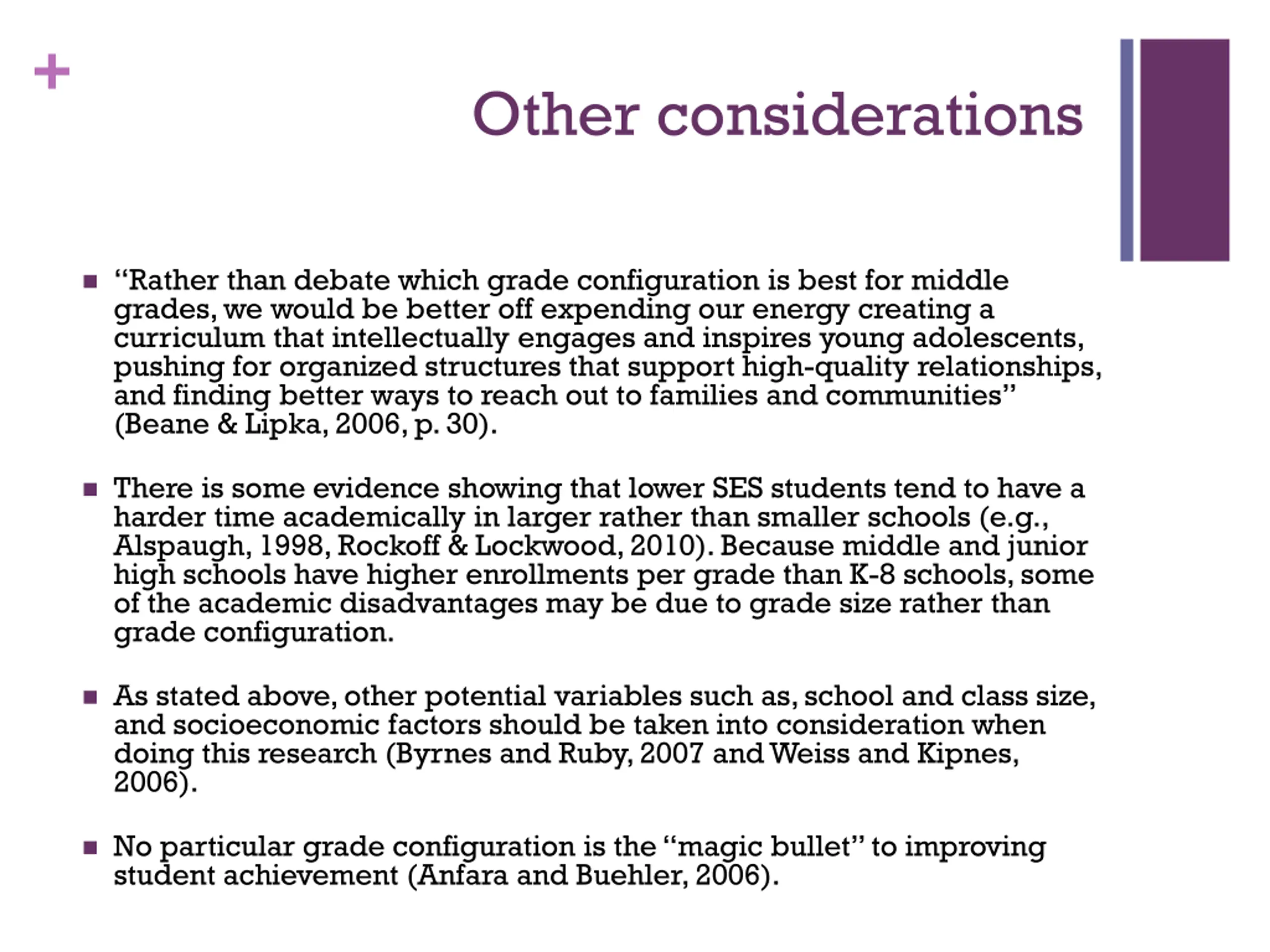 + Other considerations Rather than debate which grade configuration is best for middle grades, we would be better off expending our energy creating a curriculum that intellectually engages and inspires young adolescents, pushing for organized structures that support high-quality relationships, and finding better ways to reach out to families and communities (Beane & Lipka, 2006, p. 30). There is some evidence showing that lower SES students tend to have a harder time academically in larger rather than smaller schools (e.g., Alspaugh, 1998, Rockoff & Lockwood, 2010). Because middle and junior high schools have higher enrollments per grade than K-8 schools, some of the academic disadvantages may be due to grade size rather than grade configuration. As stated above, other potential variables such as, school and class size, and socioeconomic factors should be taken into consideration when doing this research (Byrnes and Ruby, 2007 and Weiss and Kipnes, 2006). No particular grade configuration is the magic bullet to improving student achievement (Anfara and Buehler, 2006).