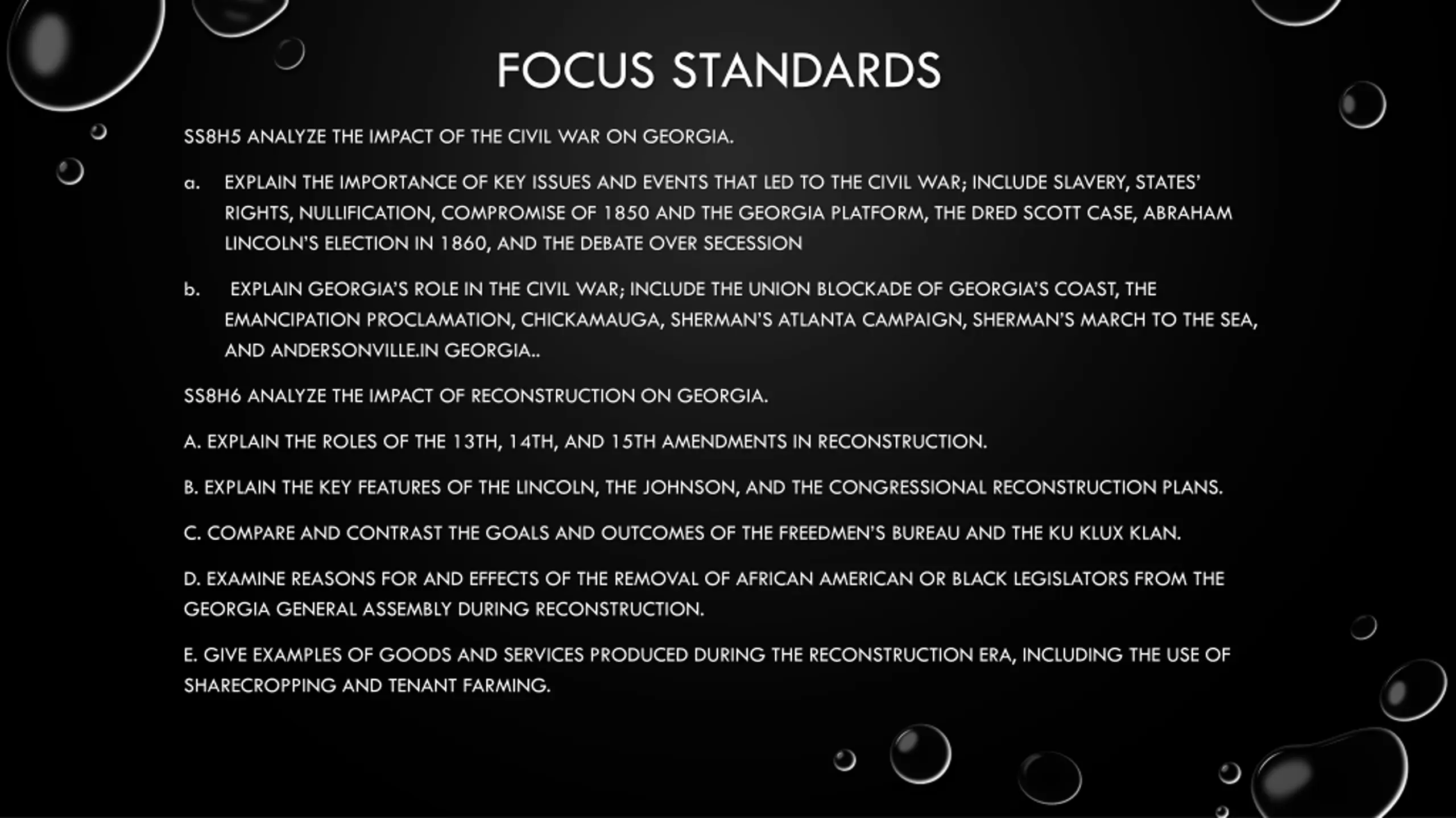 FOCUS STANDARDS SS8H5 ANALYZE THE IMPACT OF THE CIVIL WAR ON GEORGIA. a. EXPLAIN THE IMPORTANCE OF KEY ISSUES AND EVENTS THAT LED TO THE CIVIL WAR; INCLUDE SLAVERY, STATES RIGHTS, NULLIFICATION, COMPROMISE OF 1850 AND THE GEORGIA PLATFORM, THE DRED SCOTT CASE, ABRAHAM LINCOLN S ELECTION IN 1860, AND THE DEBATE OVER SECESSION b. EXPLAIN GEORGIA S ROLE IN THE CIVIL WAR; INCLUDE THE UNION BLOCKADE OF GEORGIA S COAST, THE EMANCIPATION PROCLAMATION, CHICKAMAUGA, SHERMAN S ATLANTA CAMPAIGN, SHERMAN S MARCH TO THE SEA, AND ANDERSONVILLE.IN GEORGIA.. SS8H6 ANALYZE THE IMPACT OF RECONSTRUCTION ON GEORGIA. A. EXPLAIN THE ROLES OF THE 13TH, 14TH, AND 15TH AMENDMENTS IN RECONSTRUCTION. B. EXPLAIN THE KEY FEATURES OF THE LINCOLN, THE JOHNSON, AND THE CONGRESSIONAL RECONSTRUCTION PLANS. C. COMPARE AND CONTRAST THE GOALS AND OUTCOMES OF THE FREEDMEN S BUREAU AND THE KU KLUX KLAN. D. EXAMINE REASONS FOR AND EFFECTS OF THE REMOVAL OF AFRICAN AMERICAN OR BLACK LEGISLATORS FROM THE GEORGIA GENERAL ASSEMBLY DURING RECONSTRUCTION. E. GIVE EXAMPLES OF GOODS AND SERVICES PRODUCED DURING THE RECONSTRUCTION ERA, INCLUDING THE USE OF SHARECROPPING AND TENANT FARMING.