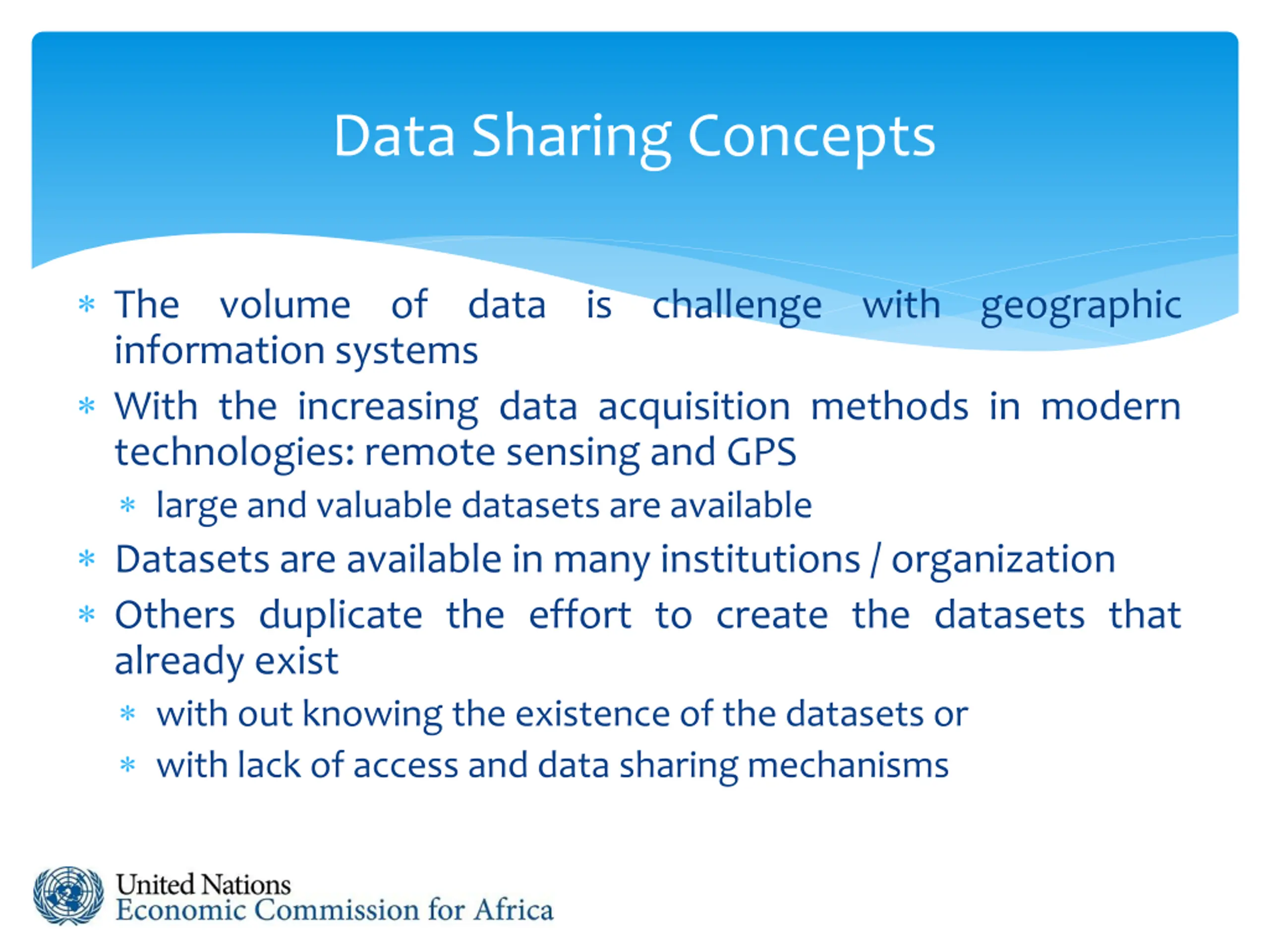 Data Sharing Concepts The volume of data is challenge with geographic information systems With the increasing data acquisition methods in modern technologies: remote sensing and GPS large and valuable datasets are available Datasets are available in many institutions / organization Others duplicate the effort to create the datasets that already exist with out knowing the existence of the datasets or with lack of access and data sharing mechanisms
