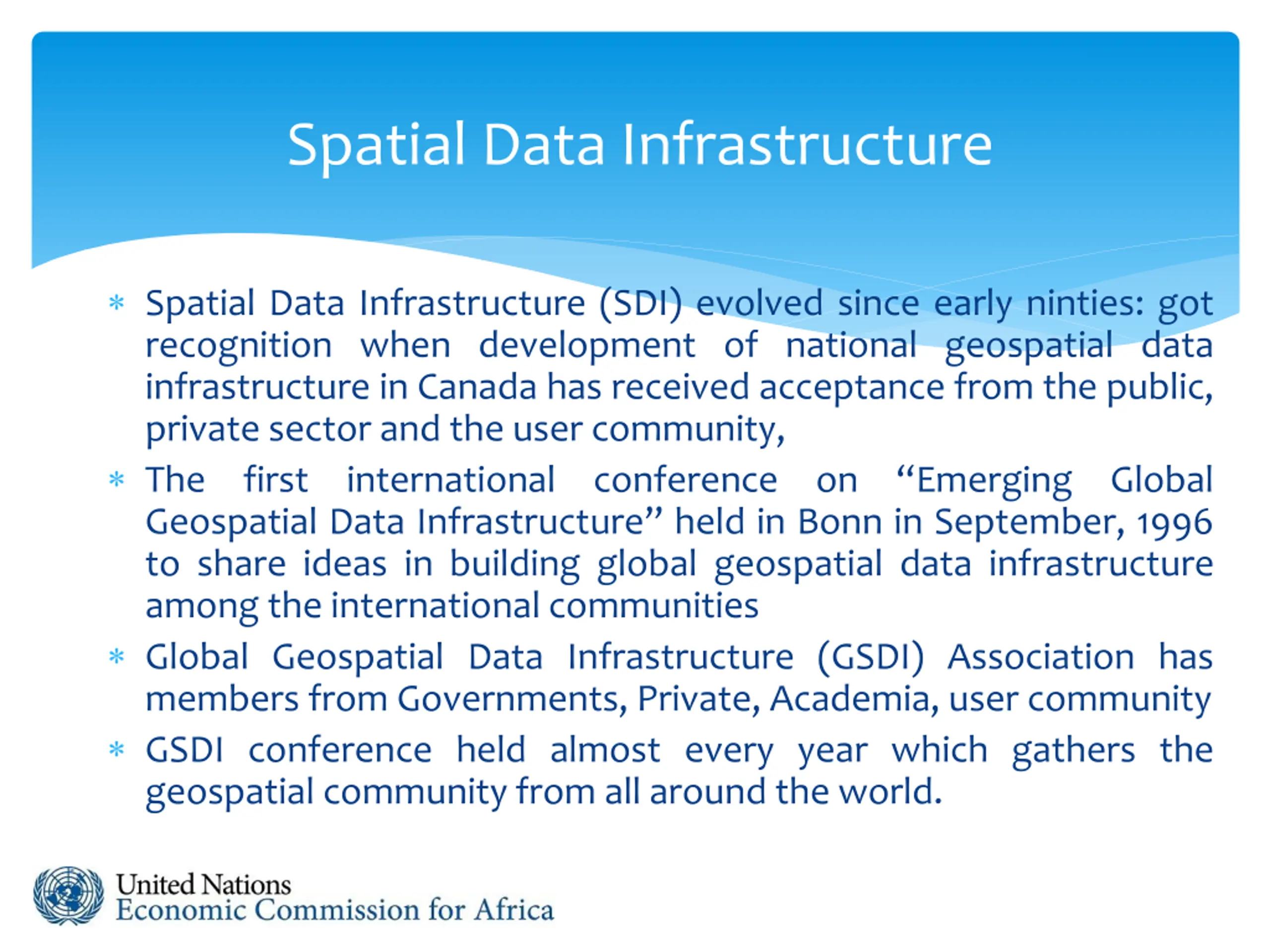 Spatial Data Infrastructure Spatial Data Infrastructure (SDI) evolved since early ninties: got recognition when development of national geospatial data infrastructure in Canada has received acceptance from the public, private sector and the user community, The first international conference on Emerging Global Geospatial Data Infrastructure held in Bonn in September, 1996 to share ideas in building global geospatial data infrastructure among the international communities Global Geospatial Data Infrastructure (GSDI) Association has members from Governments, Private, Academia, user community GSDI conference held almost every year which gathers the geospatial community from all around the world.