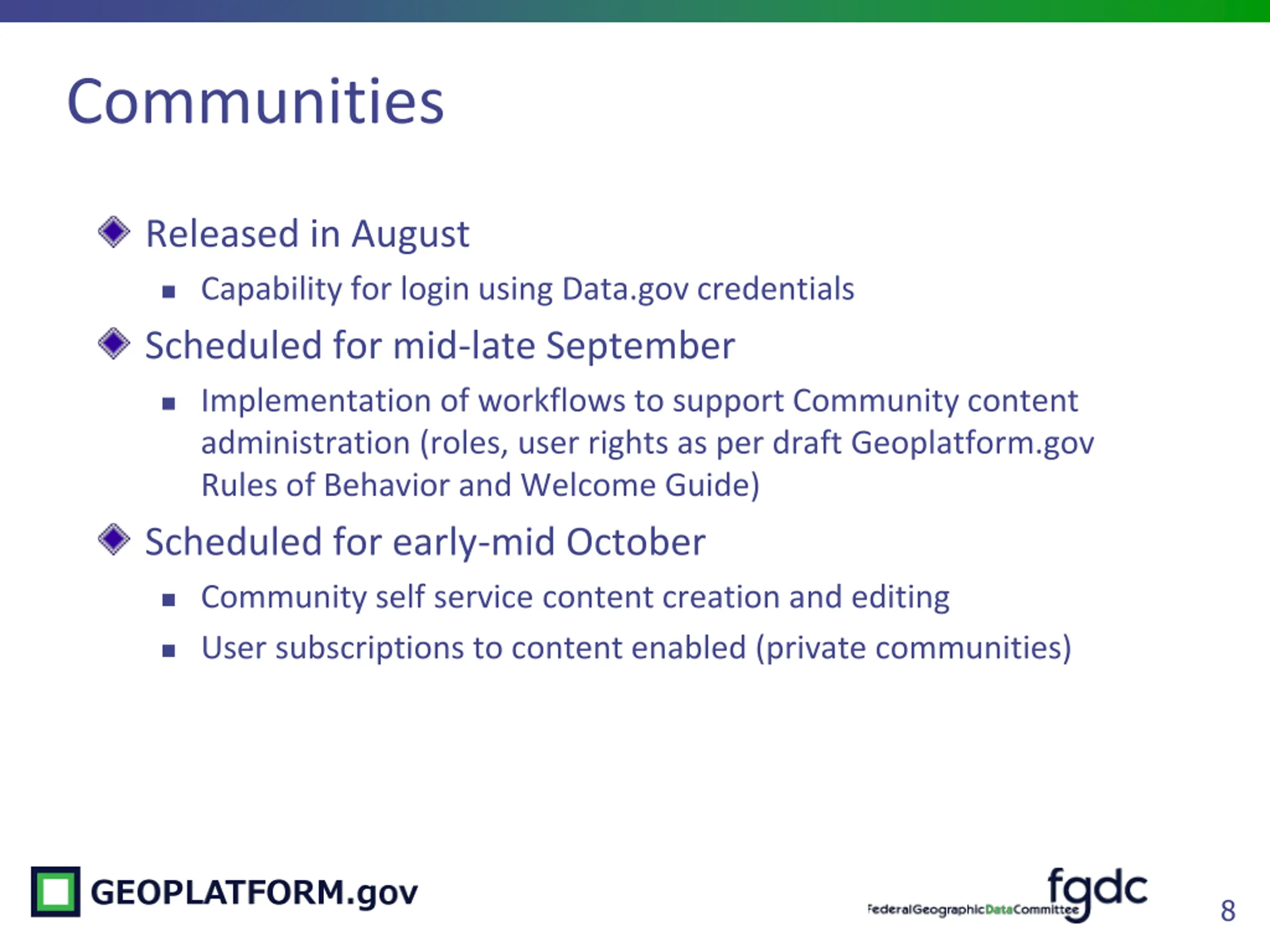Communities Released in August Capability for login using Data.gov credentials Scheduled for mid-late September Implementation of workflows to support Community content administration (roles, user rights as per draft Geoplatform.gov Rules of Behavior and Welcome Guide) Scheduled for early-mid October Community self service content creation and editing User subscriptions to content enabled (private communities) 8