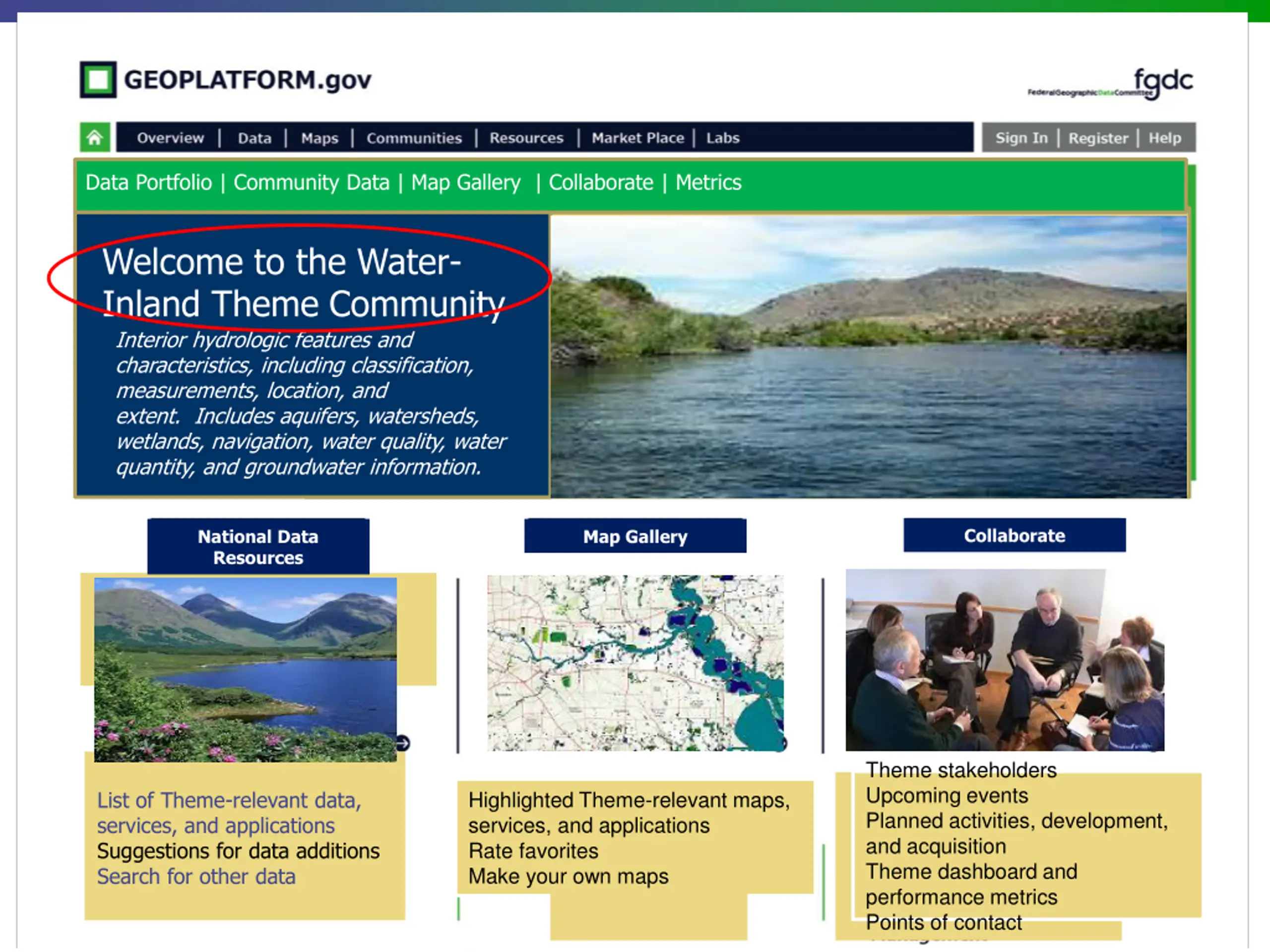 Data Portfolio Data Portfolio | Community Data | Map Gallery | Collaborate | Metrics Upcoming Events Metrics Collaborate Planned Activities Welcome and Overview Inland Theme Community Interior hydrologic features and characteristics, including classification, measurements, location, and extent. Includes aquifers, watersheds, wetlands, navigation, water quality, water quantity, and groundwater information. Welcome to the Water- Collaborate National Data Resources Map Gallery Theme stakeholders Upcoming events Planned activities, development, and acquisition Theme dashboard and performance metrics Points of contact List of Theme-relevant data, services, and applications Suggestions for data additions Search for other data Highlighted Theme-relevant maps, services, and applications Rate favorites Make your own maps 10
