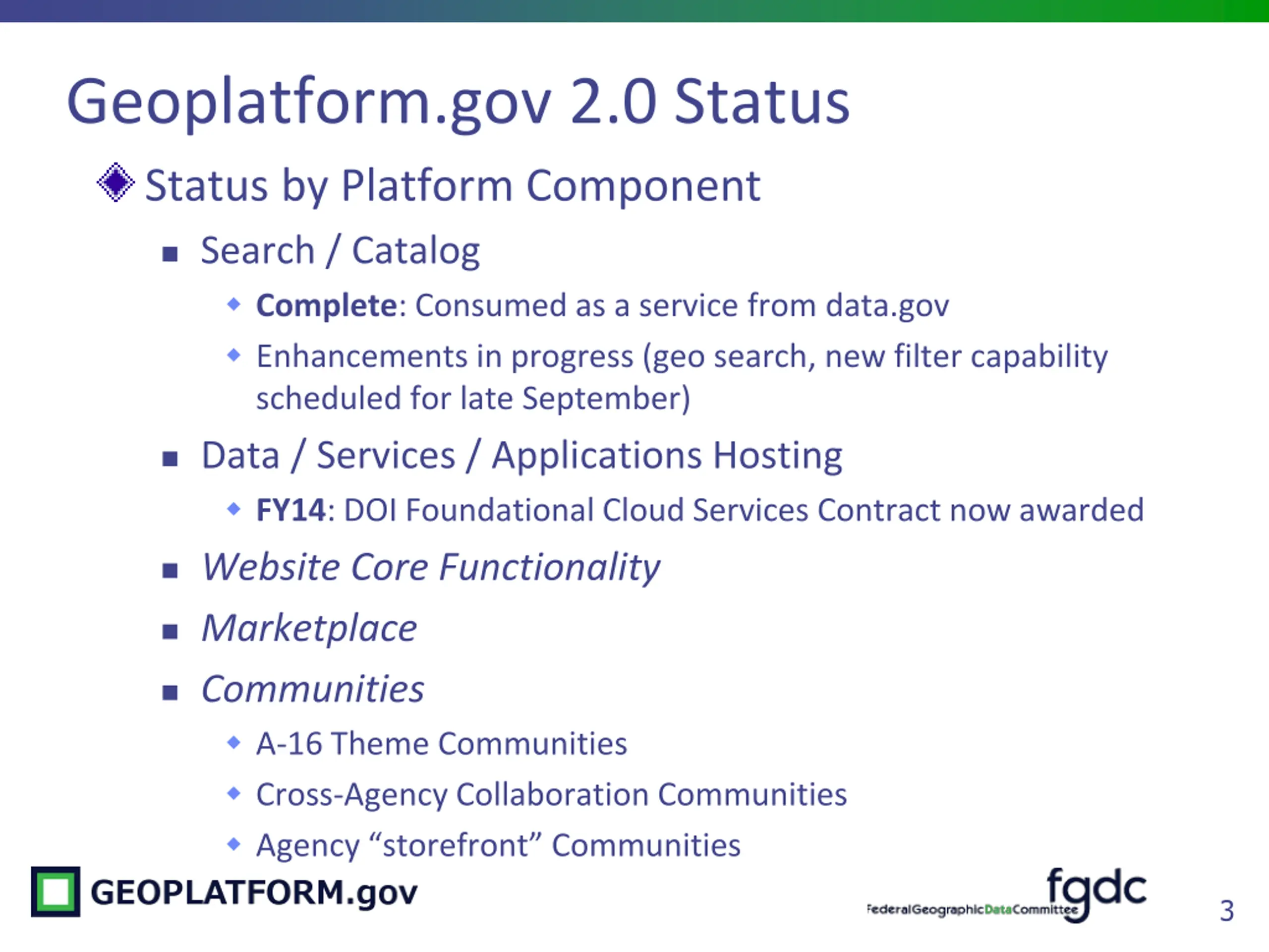 Geoplatform.gov 2.0 Status Status by Platform Component Search / Catalog Complete: Consumed as a service from data.gov Enhancements in progress (geo search, new filter capability scheduled for late September) Data / Services / Applications Hosting FY14: DOI Foundational Cloud Services Contract now awarded Website Core Functionality Marketplace Communities A-16 Theme Communities Cross-Agency Collaboration Communities Agency storefront Communities 3